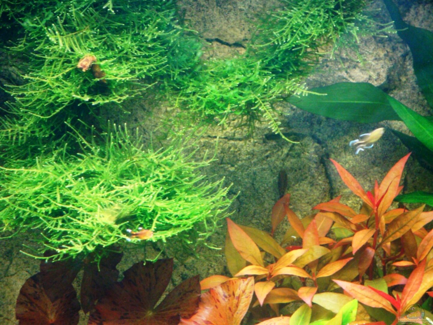 Update 10.04.2010 Echinodorus Dschungelstar Nr.2 Cyperus helferi Rotala rotundifolia Rotala sp. ´Green´ Eleocharis acicularis (Nadelsimse) Myriophyllum mezianum Pogostemon helferi Echinodorus tenellus Hygrophila corymbosa - Zwerg-Kirschblatt Althernanthera reineckii ´Bronze´ - Schmalblättriges Papageienblatt Microcanthemun umbrosum Mayaca fluviatilis Anubias bateri var. nana (auf Holz) Javamoss und Lebermoss (auf Wurzel) Nyphae lotus (Roter Tigerlotus) als [...]