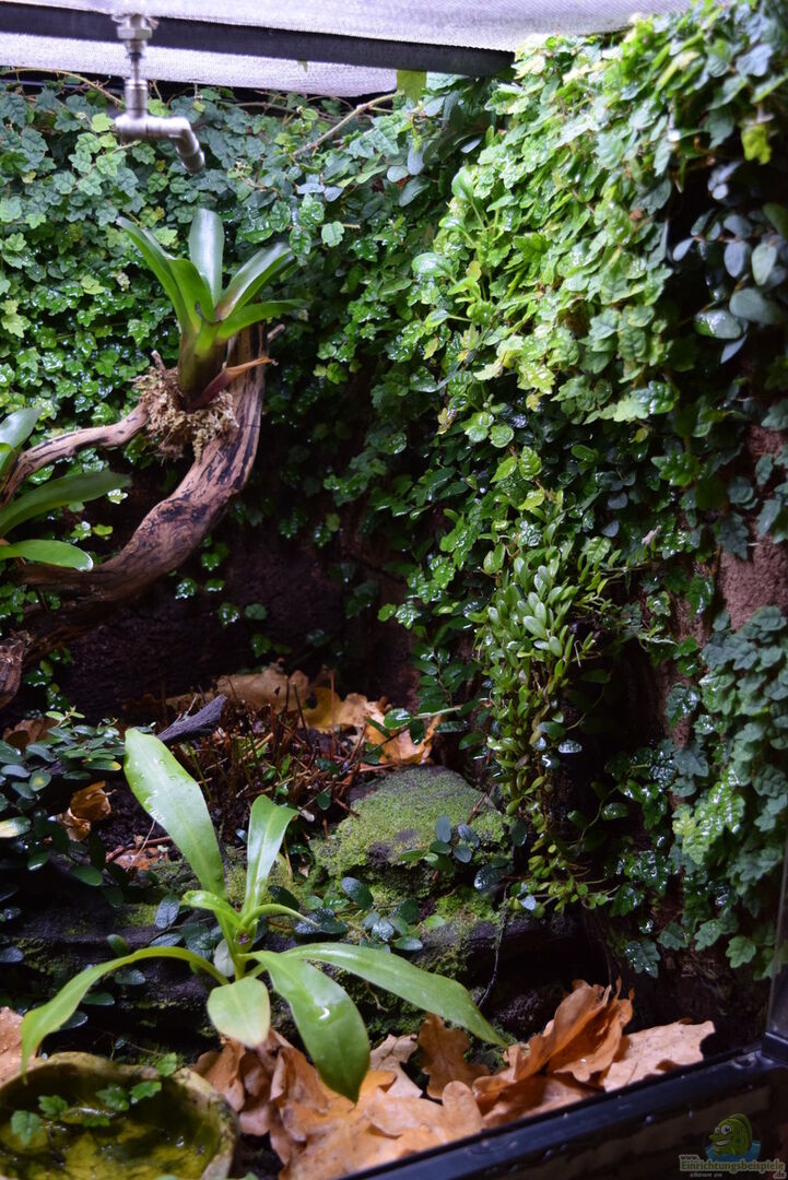 Die Rückwand besteht aus ca. 1-2 cm dicken Xaximstücken, die ich mit Aquariensilikon ans Glas geklebt hab. Zwischenräume wurden belassen. Diese hab ich anschliessend mit einem RFB-Substrat ausgefüllt. Das ist eine klebrige Masse aus Klebstoff und Torf, die einfach ans Glas gedrückt wird. Danach muss es ca. ne Woche trocken. Aus ihm wachsen mit der Zeit Moose und Farne.RFB-Substrat Xaxim (gesprochen Schaschim), ist der neuseeländische Baumfarn, den man in Scheiben geschnitten u.a. hier [...]