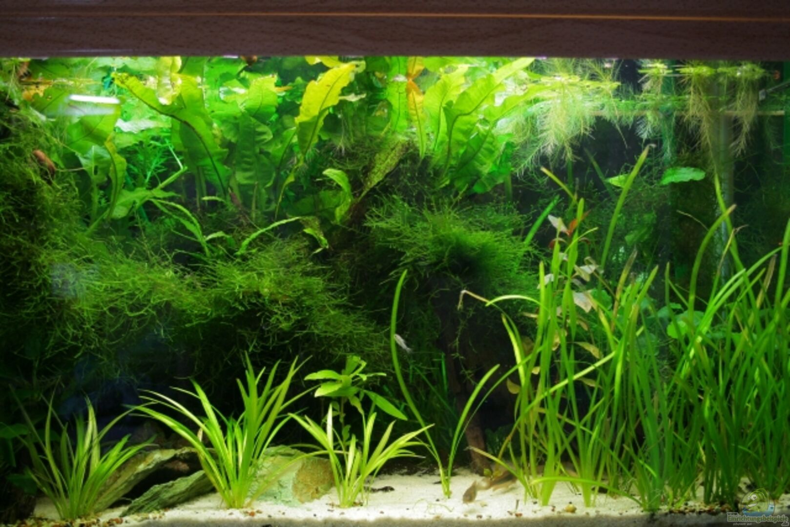 Aquarium ist von LifeTech, mit passender Abdeckung und passendem Unterschrank aus Eiche. Die Frontscheibe und die Seitenscheiben sind ein Element.