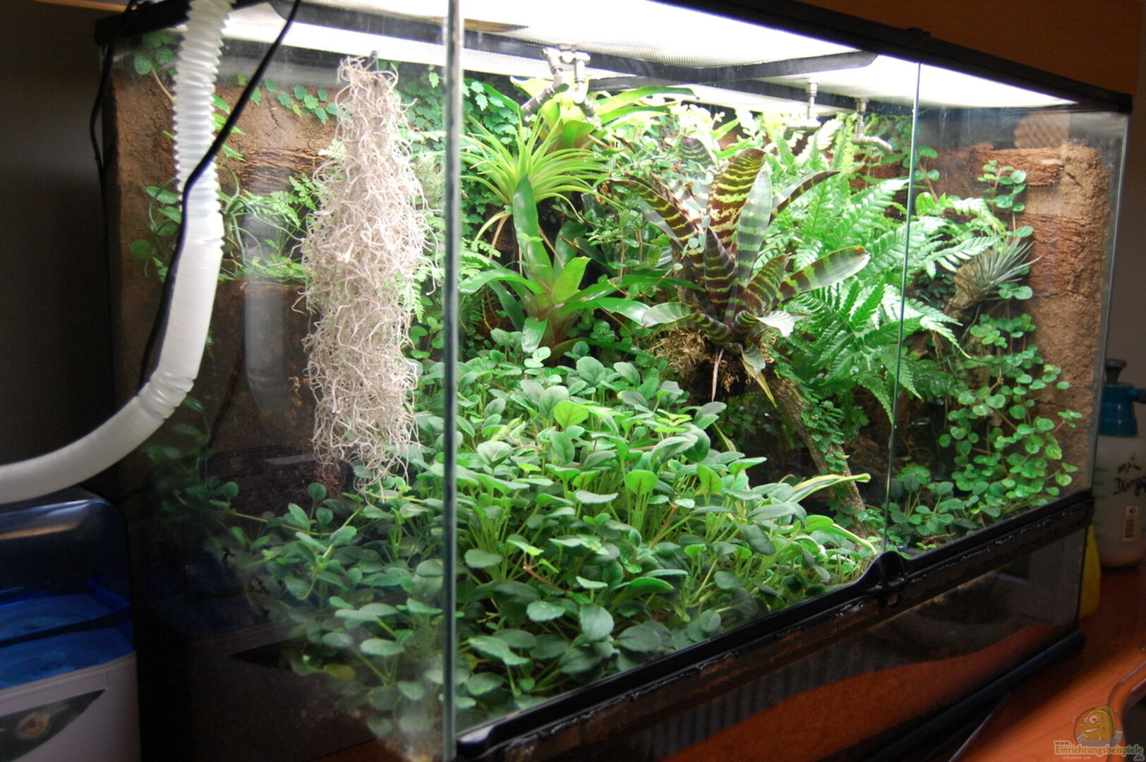 Die Rückwand besteht aus ca. 1-2 cm dicken Xaximstücken, die ich mit Aquariensilikon ans Glas geklebt hab. Zwischenräume wurden belassen. Diese hab ich anschliessend mit einem RFB-Substrat ausgefüllt. Das ist eine klebrige Masse aus Klebstoff und Torf, die einfach ans Glas gedrückt wird. Danach muss es ca. ne Woche trocken. Aus ihm wachsen mit der Zeit Moose und Farne.RFB-Substrat Xaxim (gesprochen Schaschim), ist der neuseeländische Baumfarn, den man in Scheiben geschnitten u.a. hier [...]