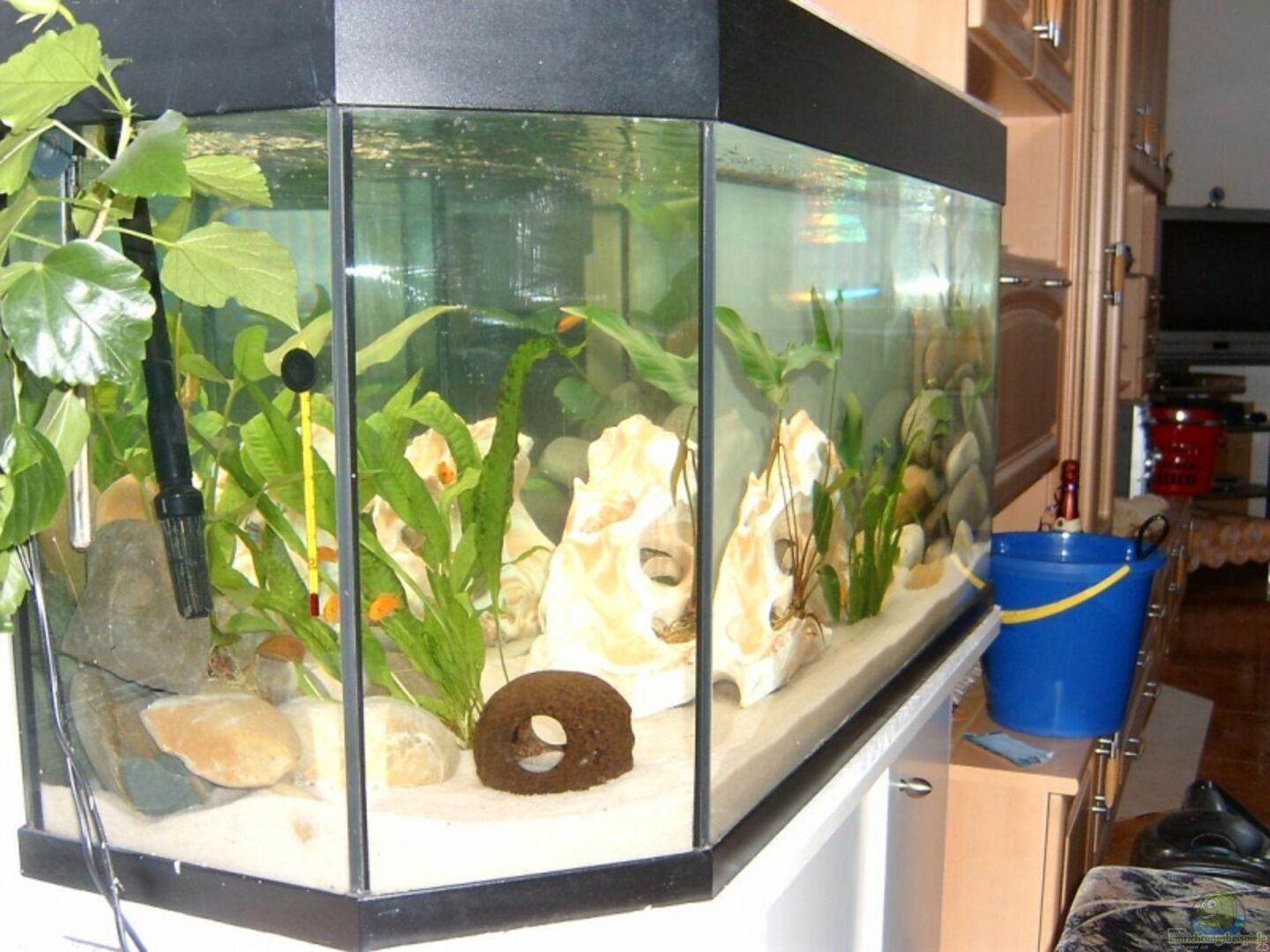 Es ist eine veraltete Juwelausführung der Sorte ´Panaorama´. Der Schrank ist marke Eigenbau, genau wie die Abdeckung. Katzentraum, weil das Aquarium den Platz des Kratzbaumes ersetzt in Hinsicht auf den Ausblick zum Vogelhaus.