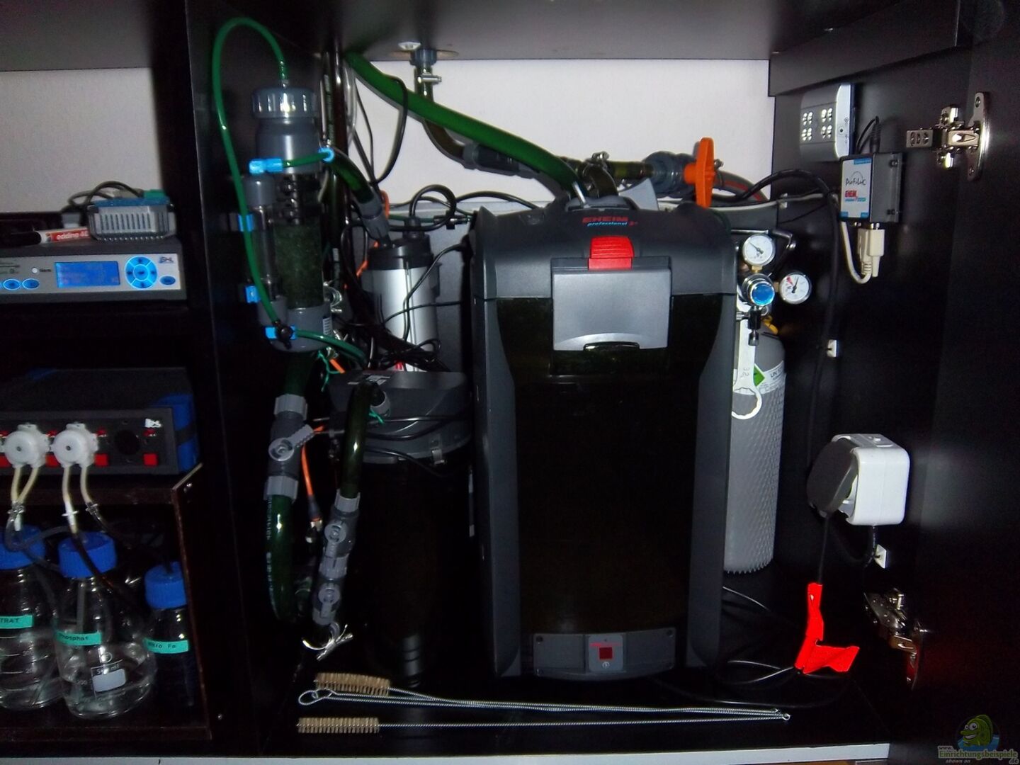 Co2 Anlage von US Aquaristik mit Aussenreaktor und Bypass. UV-Klärer Eheim reeflexUV 500 (im Dauerbetrieb an) Tunze Nanostream 6055 (in Betrieb auf minimum von 11:00 bis 15:00) 1x am Tag gibt es ein Gewitter für 10 Minuten. Die Tunze fährt dabei ihre Leistung hoch auf 70% und mixt das Beken gut durch damit die Nährstoffe gut im gesammten Becken verteilt werden - und einigen Fischis machts Spa?? Die Gesamte Steuerung für die Technik und den Gimmiks übernimmt ein Profilux3 Aquariumcomputer [...]