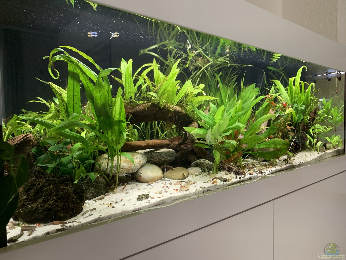 Massaquarium mit Optiwhiteglas auf 3 Seiten. Das Möbel dazu wurde bereits mit einer passenden Kiesblende von 5cm auf drei Seiten gebaut. Die Rückwand ist aussen mit einer schwarzen Folie beklebt und es gibt dadurch eine optische Tiefenwirkung.