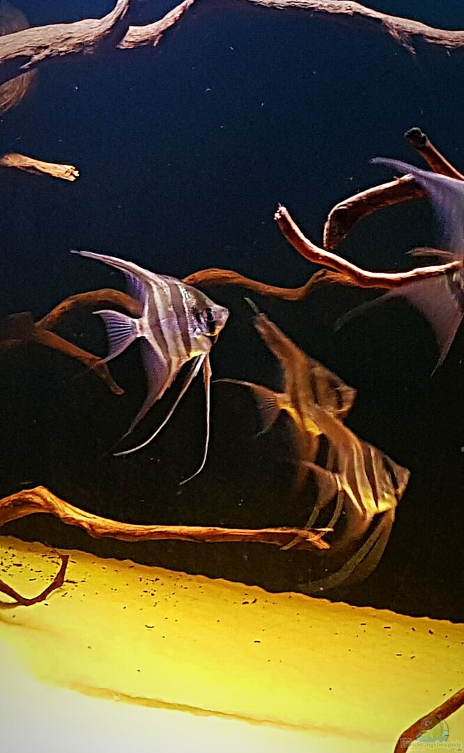 Der Besatz besteht aus: - 13 Orinoco Altum der Siegrist Linie. Diese stammen wohl ursprünglich aus dem Rio Inirida. Diese Linie zeichnet sich aus durch einen schwächeren Nasenknick und längere Flossen. Die Flossen sind leicht rose/rötlich. - 15 Metallpanzerwelsen - 3 Sturisoma Aureum - 3 L134