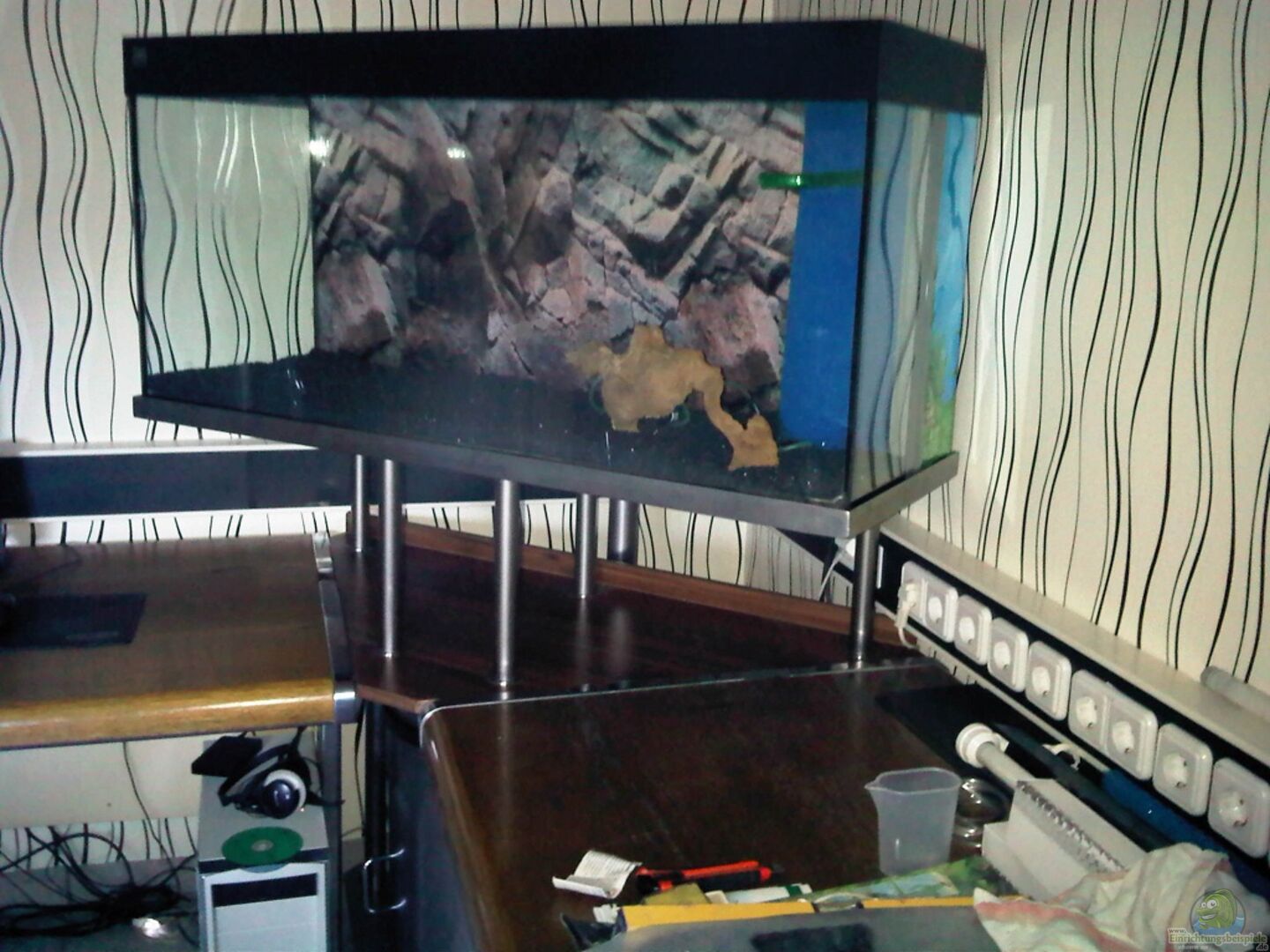3 Ebenen über 2 Terassen dargestellt. Die Terassen wurden mit Plexiglas ´zum halten gebracht´. Auf dem Plexiglas ist mit Aquariumsilikon der Bodengrund aufgeklebt. In den Terassen eingearbeitet wurden drei Höhlen aus halben Kokusnussschalen, ebenfalls mit Bodengrund beklebt.