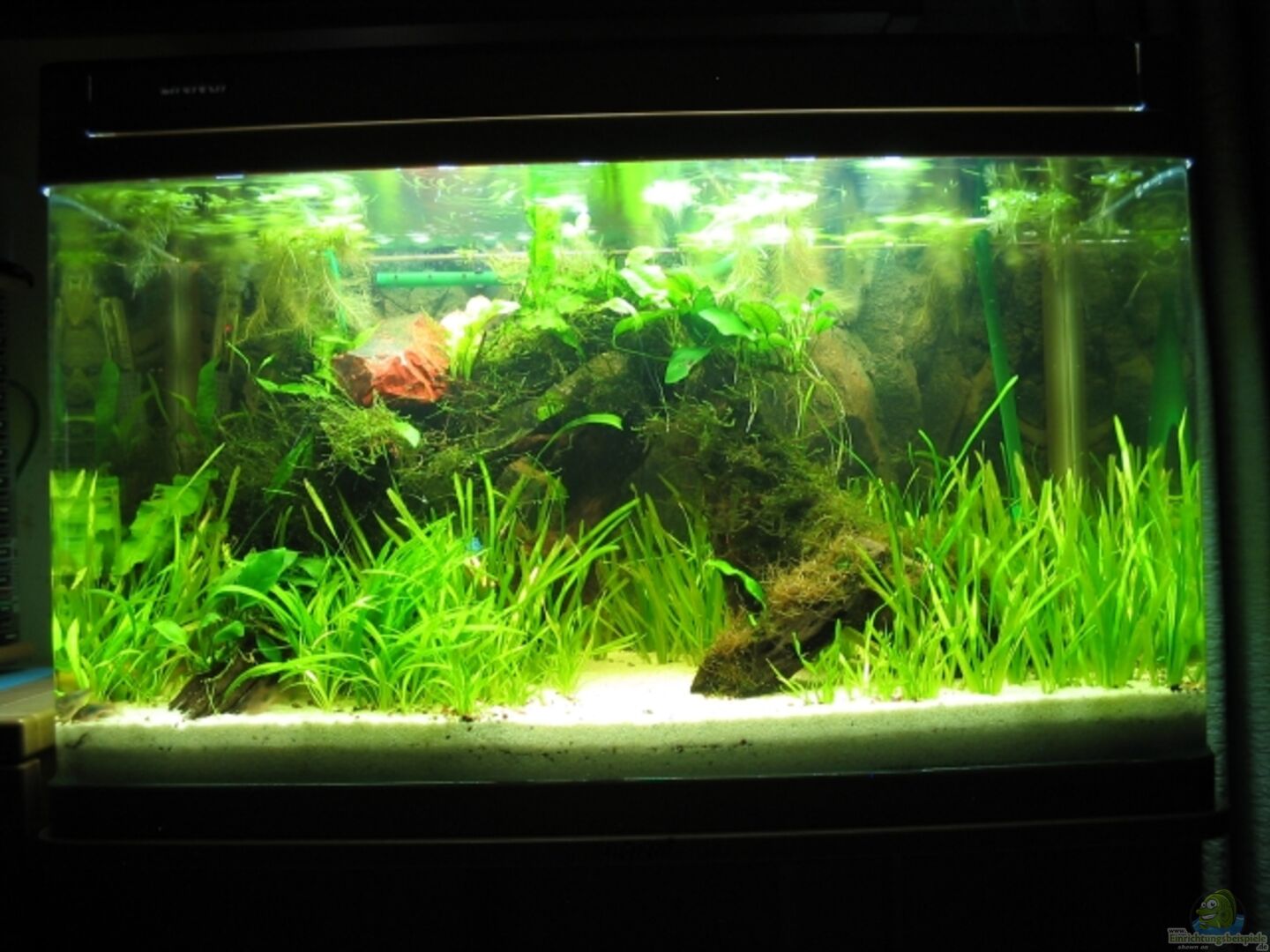 Aquarium ist von LifeTech, mit passender Abdeckung und passendem Unterschrank aus Eiche. Die Frontscheibe und die Seitenscheiben sind ein Element.