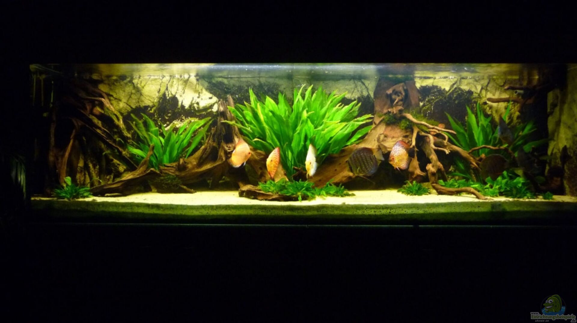 Standardbecken, sto??verklebt. Unterschrank und Abdeckung in Bucheoptik. Die Bodenscheibe ist von innen zum Schutz mit 1 cm Styropor beklebt (das Aquarium war früher mal ein Tanganjikabecken mit vielen Steinaufbauten). Auch das Becken selbst steht auf einer 1 cm Styropor-Schicht. Um die Standfläche der ganzen Kombination etwas zu vergrö??ern, steht der Unterschrank auf einer Arbeitsplatte. Damit soll die Last ein wenig gleichmä??iger auf dem Fu??boden verteilt werden.