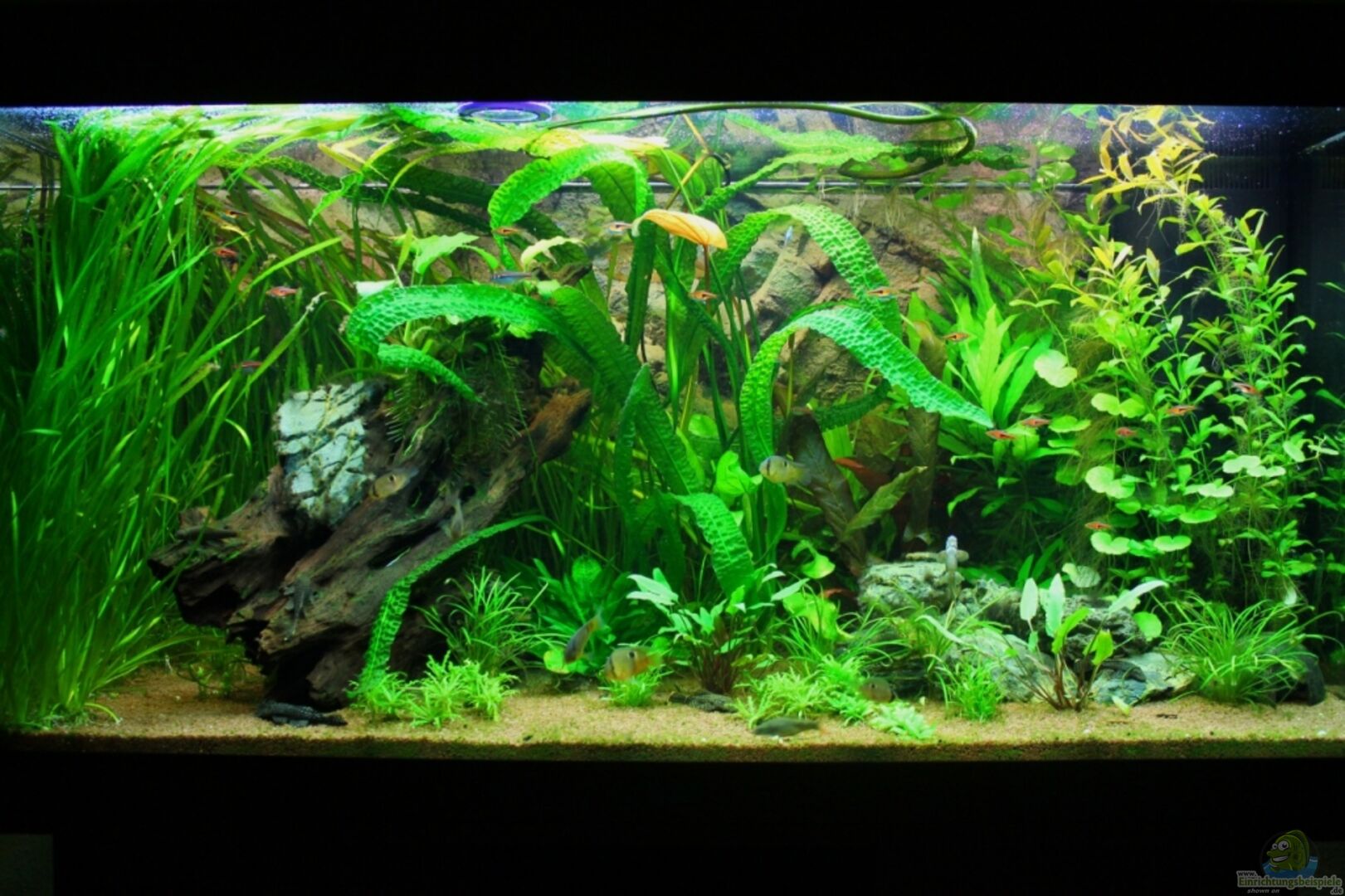 Juwel Aquarium Rio 300 mit Unterschrank ========== > Ersteinrichtung am 01.05.2011 > Dekor: warme Buche > Fotorückwand (Stein optik) > High-Lite Einsatzleuchten 120 cm, T5 Röhren 4 x 54 Watt > BL Cristal Profi e1500 Hochleistungs-Au??enfilter > Im Innenfiltergehäuse befindet sich die Technik (Schläuche, Heizung) da ein Au??enfilter benutzt wird > JBL ProFlora m602 CO2-Düngeanlage mit Nachtabschaltung