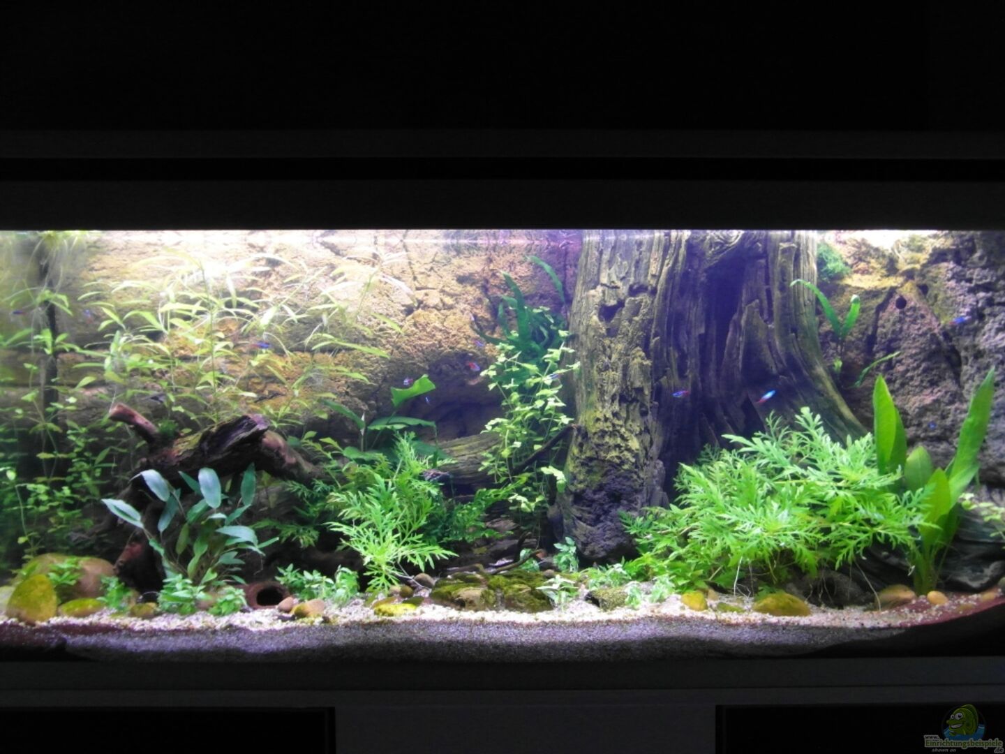 Hinterschwimm, kriech- und krabbelbare Rückwand, welche an den unteren und seitlichen Kanten nur punktuell mit JBL Haru verklebt wurde. Das Wasser kann somit u.a. durch die entstandenen "Verklebelücken" zirkulieren. Darüber hinaus ist der hintere Bereich der Rückwand durch einen 7 x 5 cm gro??en Durchgang zugänglich, welcher sich im linken unteren Bereich befindet. Auch hier gelangt Wasser hinter die Rückwand um einem Stillstand des Wassers entgegen zu wirken.