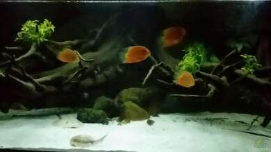 Aquarium hat eine zweigeteilte Bodenscheibe mit zusätzlichen Steg auf der Verklebung. Auf den Querstreben ist eine 20cm breite Mittelstrebe. Selbst gebaute Abdeckung aus Plexiglas. Damit sich die Plexiglas-Platten nicht durchhängen, sind sie mit Holzlatten verschraubt. Die Blende (160x10cm) ist mit doppelseitigen Klebeband befestigt.