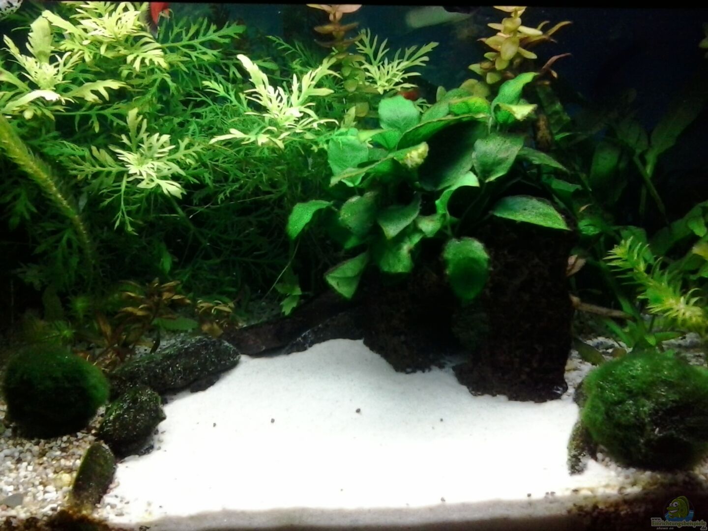 Dekoration: - 1x Lava-Stein mit Loch, darauf die Anubias Nana - Mehrere bunte Steine - 1 x Mopani Wurzel, darauf Anubias - 1 x großer Jaspis, darauf Anubias