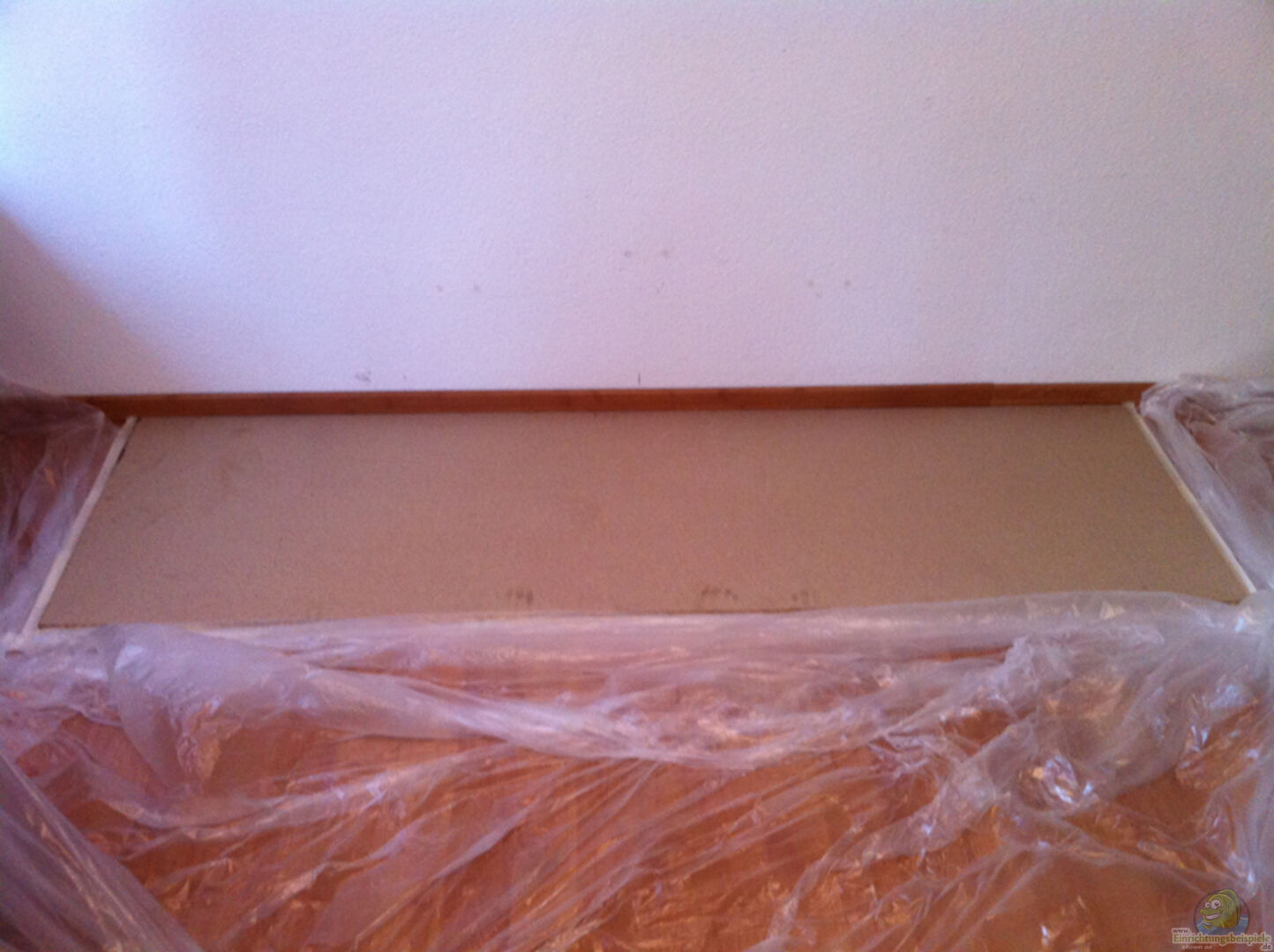 Sonderanfertigung 12 mm starken Floatglas sto??verklebt. Innen mit Sicherheitsnaht, zwei Querstege aus Glas. Unterbau mit 17, 5cm Ytong-Steinen und 5cm Steine an der Rückseite. Ausgelegt mit Laminat passend zum Boden. 5cm Multiplexplatte. 5mm Styrodur zum Ausgleich zwischen Platte und Glas.
