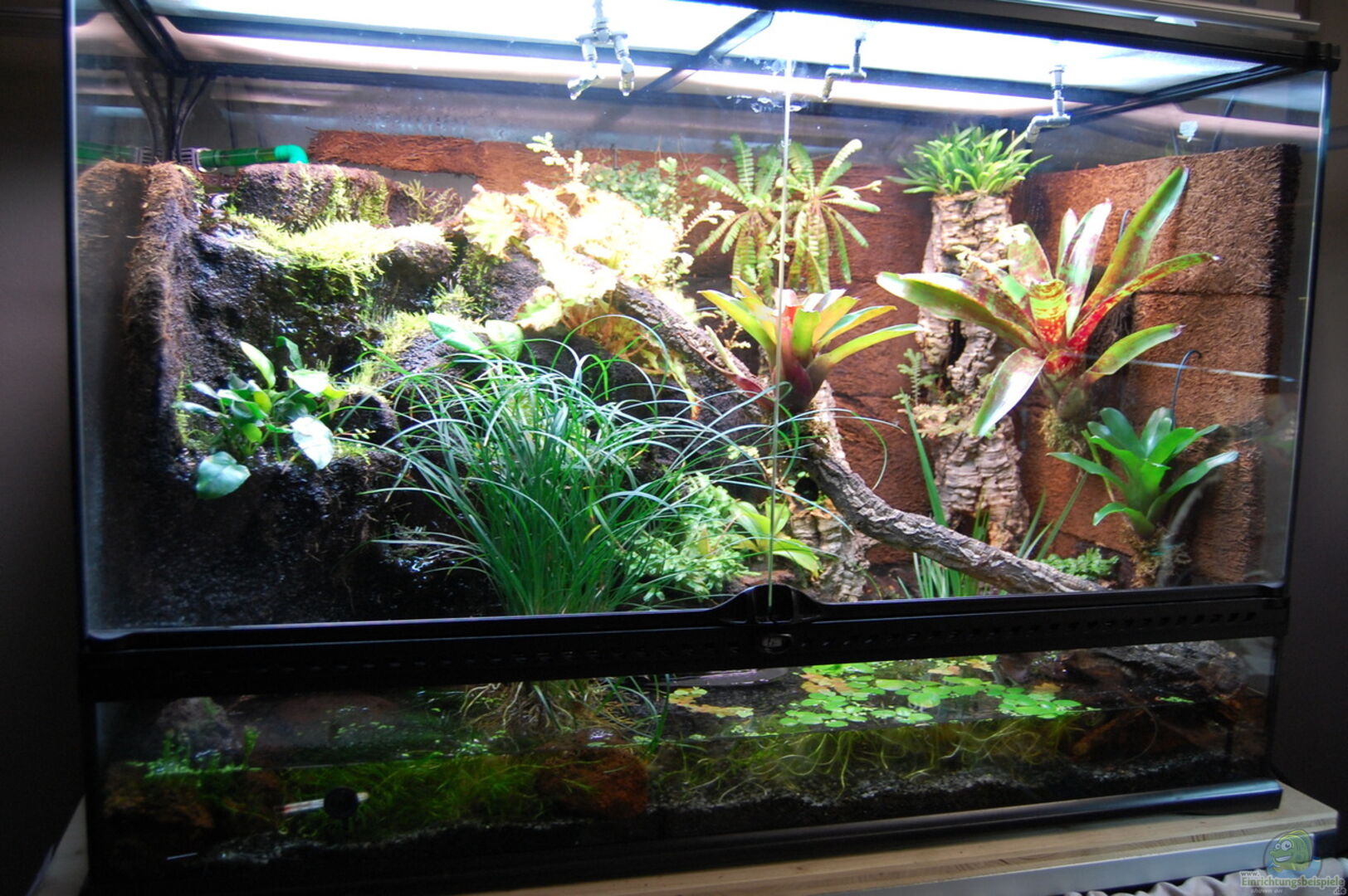 Rückwand besteht aus 1-2 cm dicken Xaxim-Platten (Neuseelandfarn), die mit Aquariensilikon festgeklebt wurden. Als weitere Deko-Elemente verwende ich hohle Korkeichenrinde, welche bepflanzt sind, Lava-Gestein und Weisstorfplatten. Die folgenden Bilder zeigen die Veränderung des Terrariums im Laufe der Zeit mit Datumsangabe.