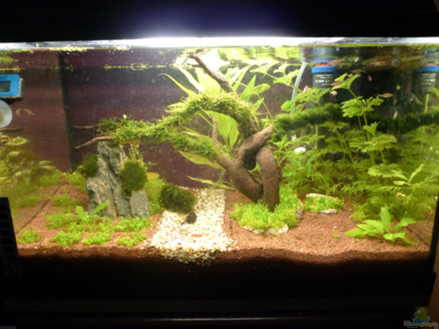 Da ich das Becken geschenkt bekommen habe, habe ich mich einfach mal aus spa??es mal an Aquascaping versucht ;) Ziel war es ein kleine Landschaft mit Stein und Baum und einem Weg zu erschaffen. Das Becken gehört eigentlich meiner kleinen Schwester und hat einige Umbauten miterlebt wie ihr auf den Bildern sehen könnt. Geplant ist das Becken in einigen Monaten in ein Nanoriff umzuwandeln.