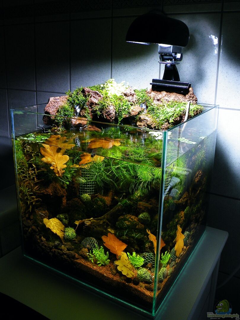 Eine kleine Oase im Badezimmer Für die Futter-Schneckenzucht meiner Erbsenkugelfische hatte ich bis dato (10.11.2010) ein 12L Becken im Bad stehen, welches auch der Aufzucht der Danio Choprae diente. Um den Anblick etwas zu verschönern, entschied ich mich für dieses etwas grö??ere AQ. Die beiden Wände sind aus mit transparentem Silikon verklebtem Lavagestein entstanden und der Auslauf des Eck-HMF wurde zweigeteilt, um den Eindruck eines kleinen Wasserfalls nachzuahmen. Die Technik [...]