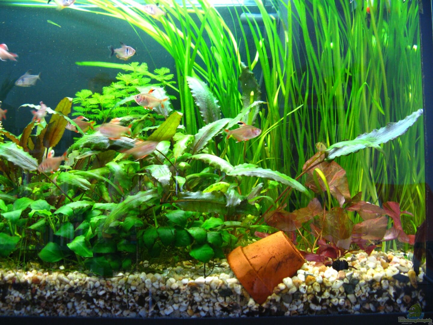 Ziel ist es, in der rechten Beckenhälfte einen dichten Wasserpflanzendschungel zu bilden, welcher auch den Filterkasten verdeckt. Die Vielfalt der Pflanzen wird in den nächsten Monaten nach und nach erhöht. Die linke Seite wird von der Mangrovenwurzel und einer grossen Solitärpflanze (Echinodorus bleheri) dominiert. Links vorne wird das Becken mittels Schwimmpflanzen abgedunkelt. Hintergrund: - Vallisneria americana, wuchert enorm, Ausdünnung jede Woche notwendig - Echinodorus bleheri, [...]