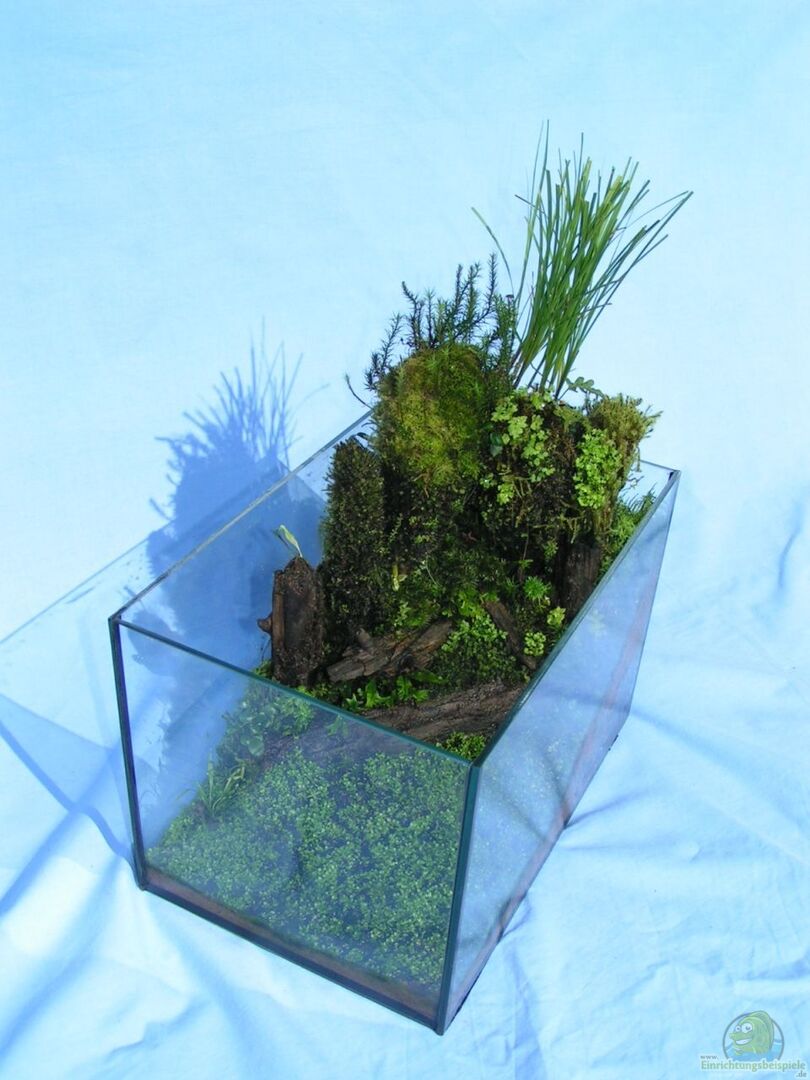 Hallo, das besondere an diesem Becken ist, dass es OHNE WASSER läuft. Tatsächlich besteht es aus zwei 12l Becken die aufeinander stehen. Darin habe ich ein Millieu geschaffen in dem Aquarienpflanzen und Moose gut emers also "über Wasser" im Gegenteil zu submers "unter Wasser" wachsen können.