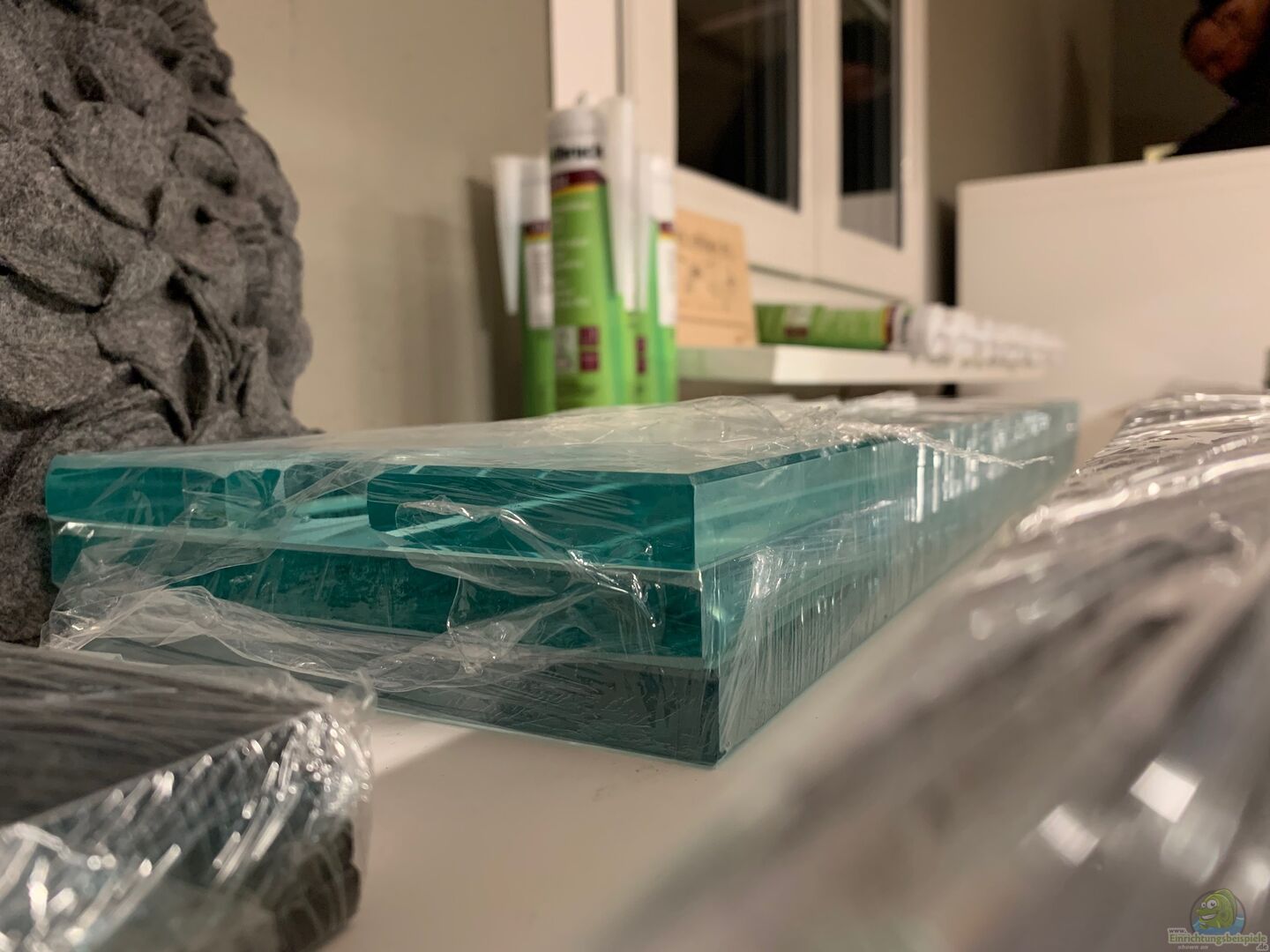 Vor-Ort verklebtes Aquarium mit 15mm Glas, Diamantgeschliffen mit Blenden aus Schwarzglas. 3 Bohrungen im Boden