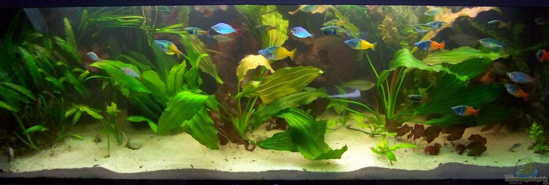 * Klassisches Rechteckaquarium mit stabilisierter Anrichte aus Holz als Unterschrank. * Als Rückwand habe ich einfach schwarz-graues Krepppapier hinters Aquarium platziert und zwischen Glas und Papier ein paar künstliche Pflanzen geklemmt. Habe dadurch eine gute Tiefenwirkung erreicht. Die Valisnerien im Hintergrund passen gut dazu.