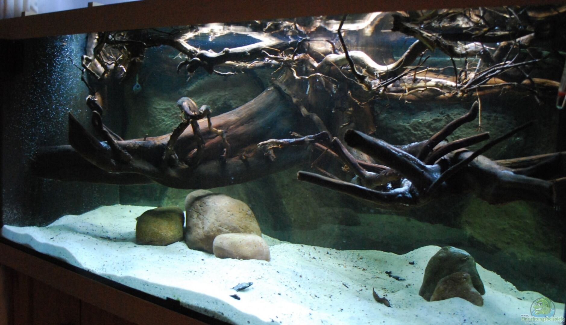 Aquarium hat eine zweigeteilte Bodenscheibe mit zusätzlichen Steg auf der Verklebung. Auf den Querstreben ist eine 20cm breite Mittelstrebe. Selbst gebaute Abdeckung aus Plexiglas. Damit sich die Plexiglas-Platten nicht durchhängen, sind sie mit Holzlatten verschraubt. Die Blende (160x10cm) ist mit doppelseitigen Klebeband befestigt.