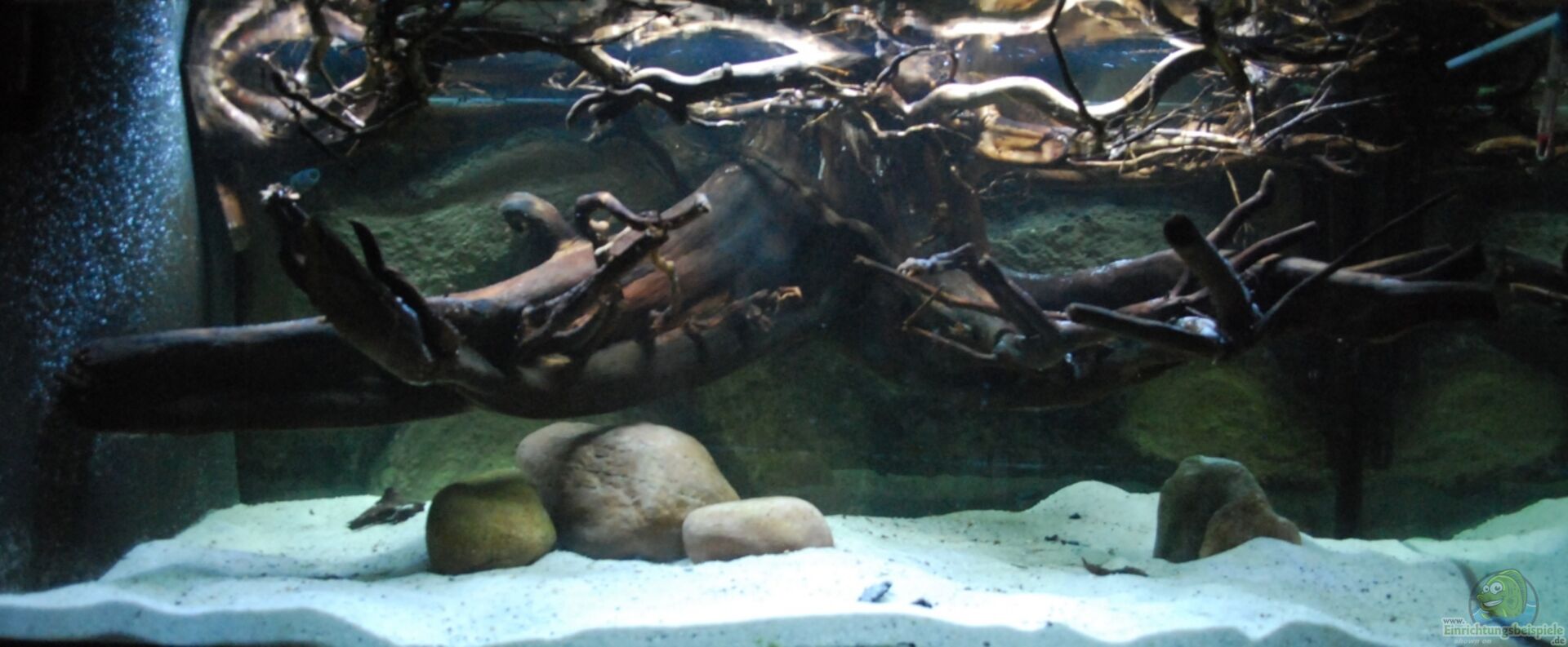 Aquarium hat eine zweigeteilte Bodenscheibe mit zusätzlichen Steg auf der Verklebung. Auf den Querstreben ist eine 20cm breite Mittelstrebe. Selbst gebaute Abdeckung aus Plexiglas. Damit sich die Plexiglas-Platten nicht durchhängen, sind sie mit Holzlatten verschraubt. Die Blende (160x10cm) ist mit doppelseitigen Klebeband befestigt.