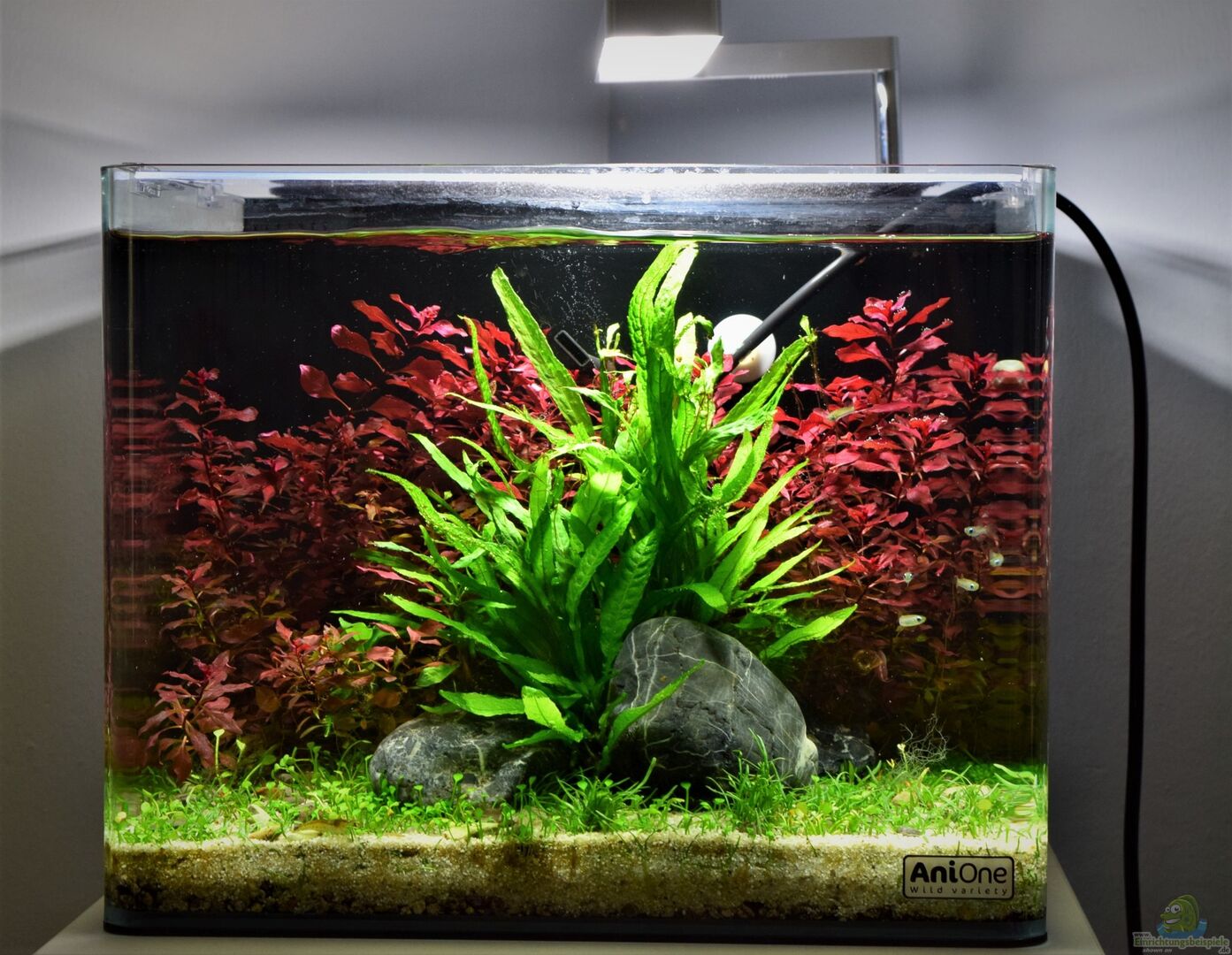 Bei diesem Aquarim handelt sich um ein Kompletset von Anione, welches mit Licht, Heizstab, Pumpe, Matte, Weissglasbecken mit gerundeten Scheiben und einer Glasabdeckung ausgestattet ist. Im hintereren Teil befindet sich eine fest eingebaute Filterkammer, die man mit verschiedenen Filtermaterialien bestücken kann.