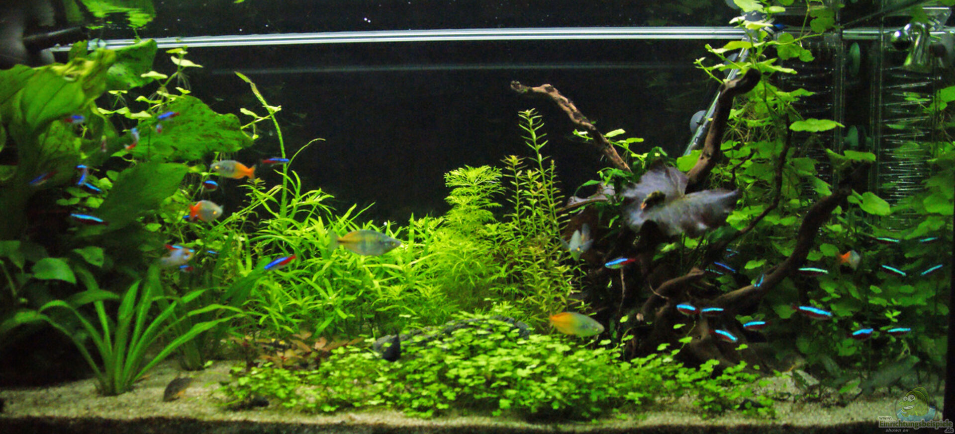 Wasser aus dem alten AQ zu 2/3 übernommen, damit ich die Fische gleich wieder einsetzen konnte, 1/3 Osmosewasser. Eingefahren Filter aus dem alten AQ ebenfalls übernommen.