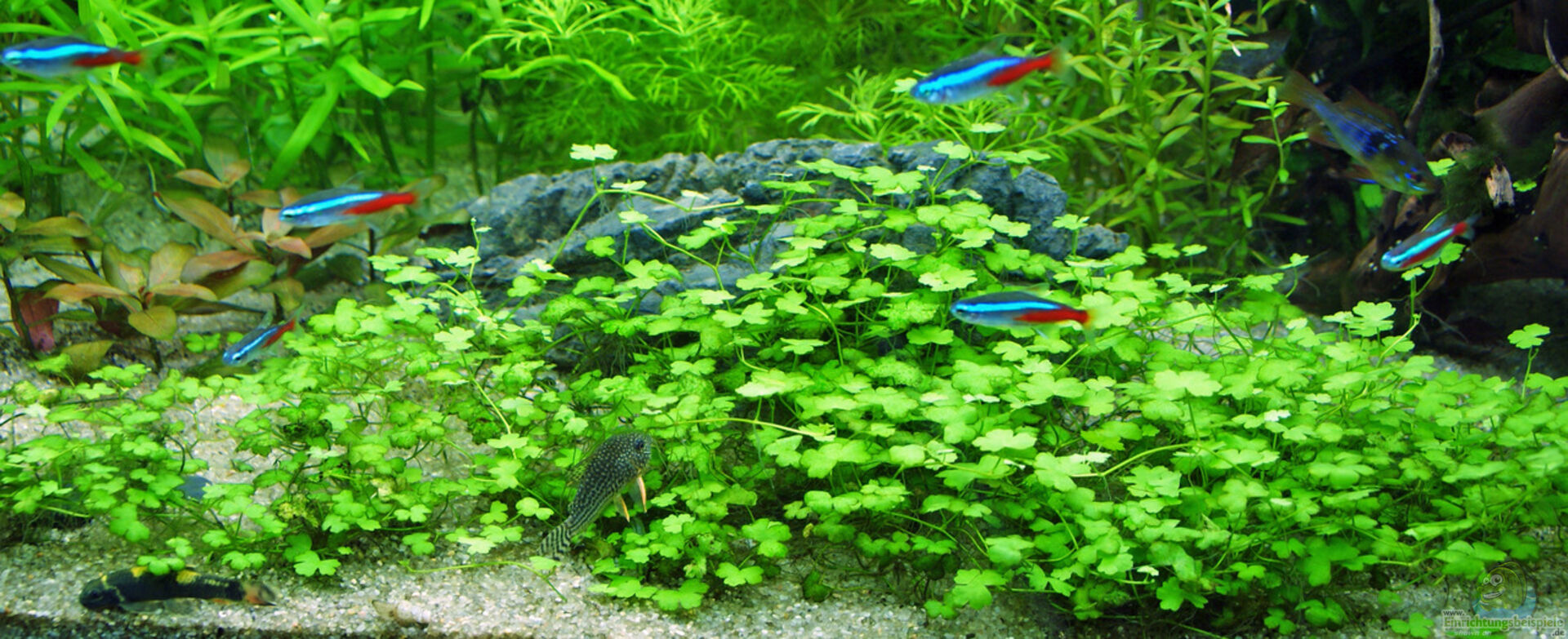 Anubia barteri / Zwergspeerblatt auf Wurzel und Stein Micrrosorum pteropus / Javafarn auf Wurzel Echinondorus Ozelot / rote Schwertpflanze Echinondorus / Schwertpflanze Rotala rotundifolia / kleine Rotala Heteranthera Zosterifolia / Seegrasblättriges Trugkölbchen Hydrocotyle leucocephala / Brasilianischer Wassernabel Hydrocotyle sibthorpioides / kleinblättriger Wassernabel Nymphaea lotus rot / Roter Tigerlotus Cryptocoryne wendtii / Wasserkelch Gedüngt wird: 1 [...]