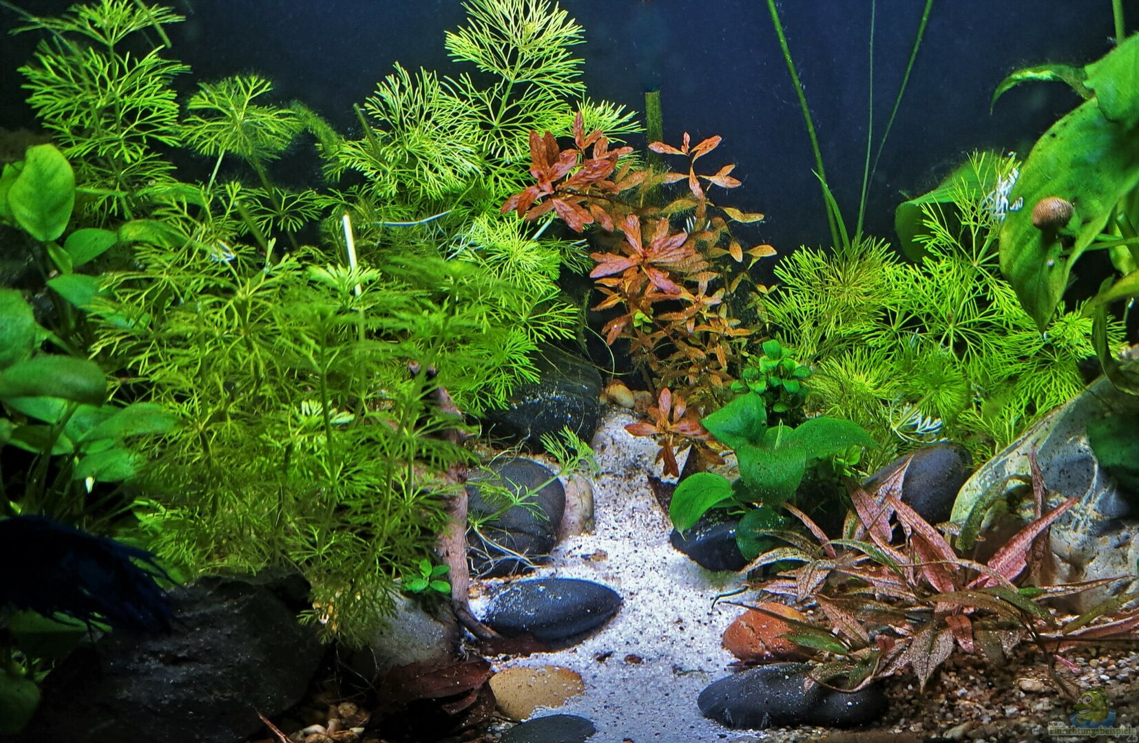 Der Bodengrund an der rechten Seite über 10 cm aufgeschüttet, es befinden sich Steinaufbauten im Becken und der Wasserstand ist um mehrere Zentimeter gesenkt( verdeckt durch eine Klebefolie) um dem Betta den Weg zur Oberfläche zu erleichtern. Die Einordnung in den Bereich Asien rechtfertigt sich hauptsächlich durch den Bewohner, weniger durch die Bepflanzung.