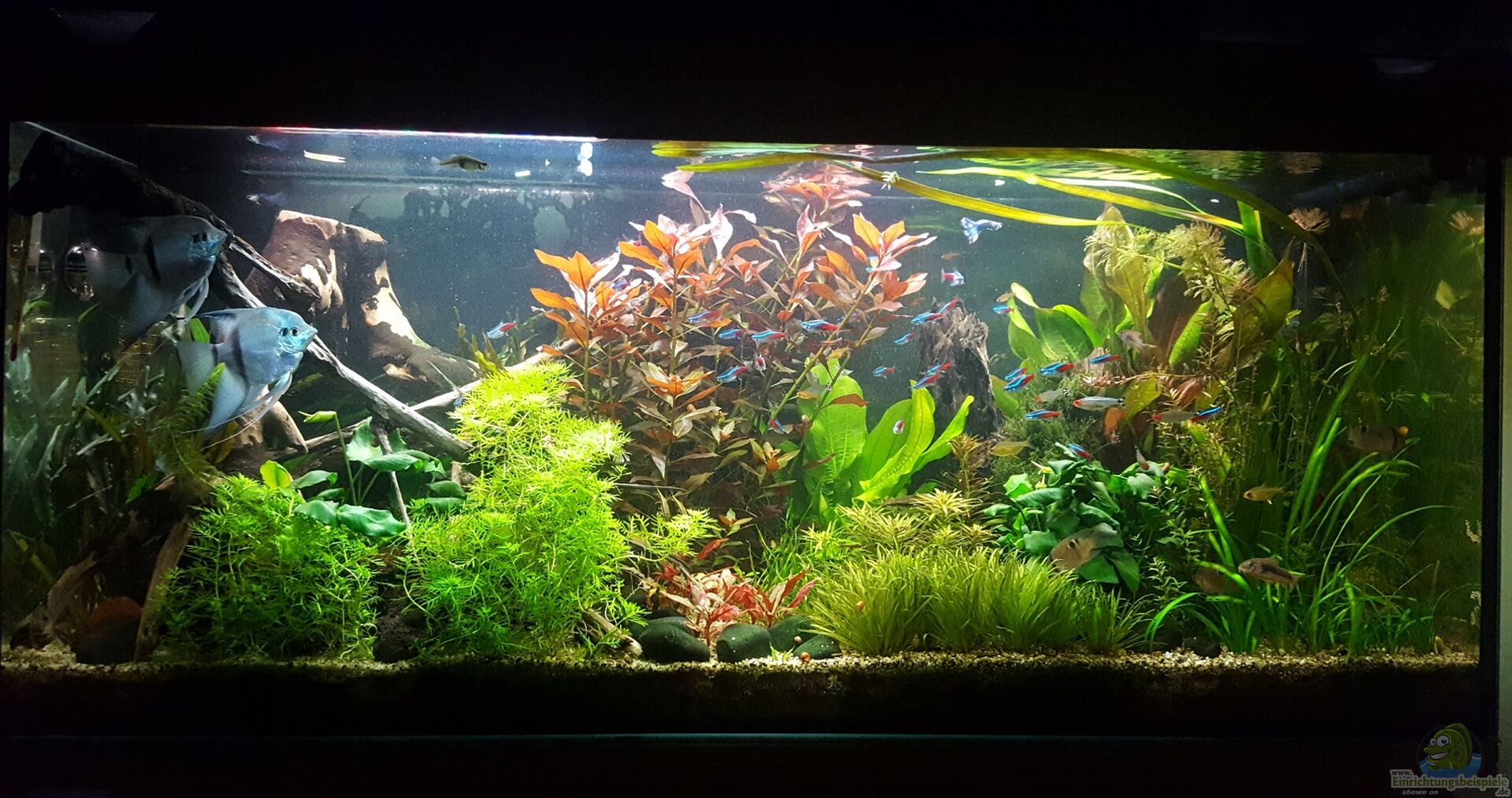 Das Becken ist ein Floatglas Becken mit Sto??verklebung, hatte diese Jahrelang offen, nach dem Umzug habe ich mir dann eine Juwel Abdeckung besorgt, mit T8 Röhren ausgestattet. Habe diese später durch LED ersetzt Die Rückwand habe ich mit schwarzer Posterfolie abgedeckt. Da da Becken leider schon auf seinen Platz stand und schon eingerichtet, konnte ich diese leider nur schwer befestigen.