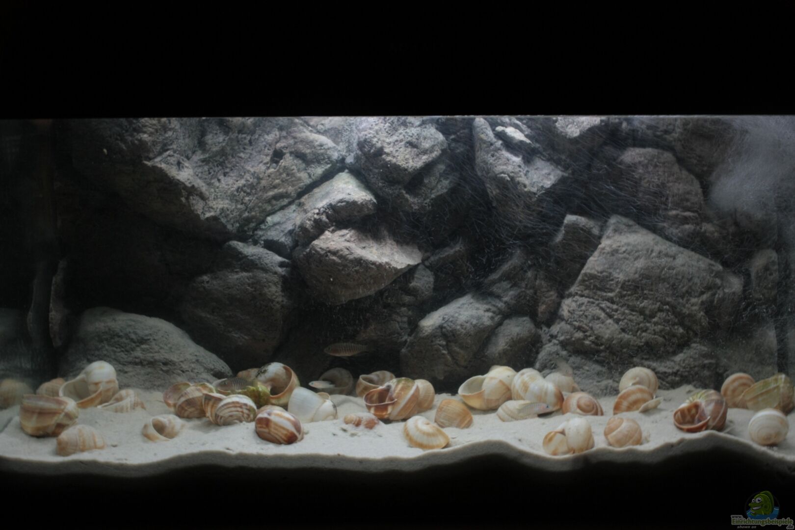 Standardbecken mit Original Abdeckung Der Beckenname bedeutet grabender Zwerg auf Suaheli, eine weitverbreitete Sprache rund um den Tanganjikasee. Und ich denke diese Worte beschreiben Neolamprologus multifasciatus am Besten. Das Becken steht auf meinem Schreibtisch und ist eine Entspannungshilfe.
