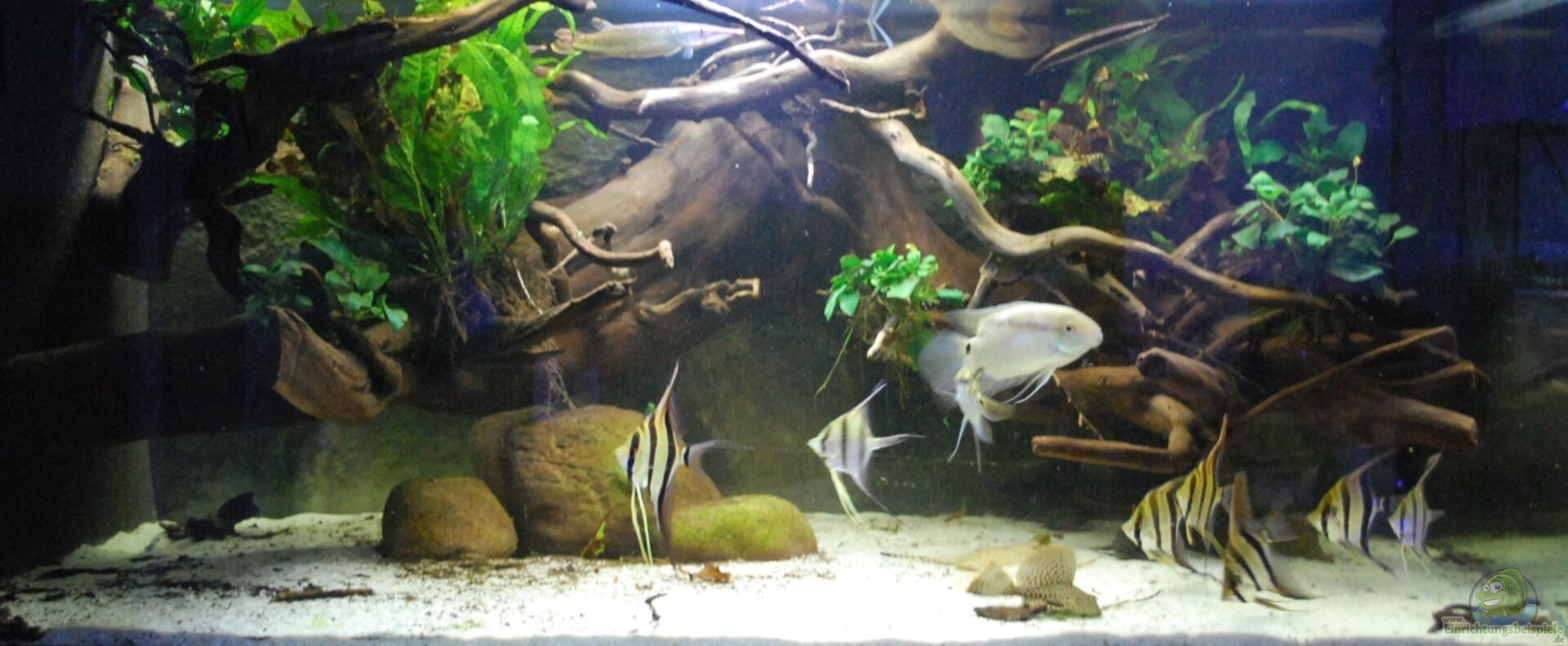 Aquarium hat eine zweigeteilte Bodenscheibe mit zusätzlichen Steg auf der Verklebung. Auf den Querstreben ist eine 20cm breite Mittelstrebe. Selbst gebaute Abdeckung aus Plexiglas. Damit sich die Plexiglas-Platten nicht durchhängen, sind sie mit Holzlatten verschraubt. Die Blende (160x10cm) ist mit doppelseitigen Klebeband befestigt.