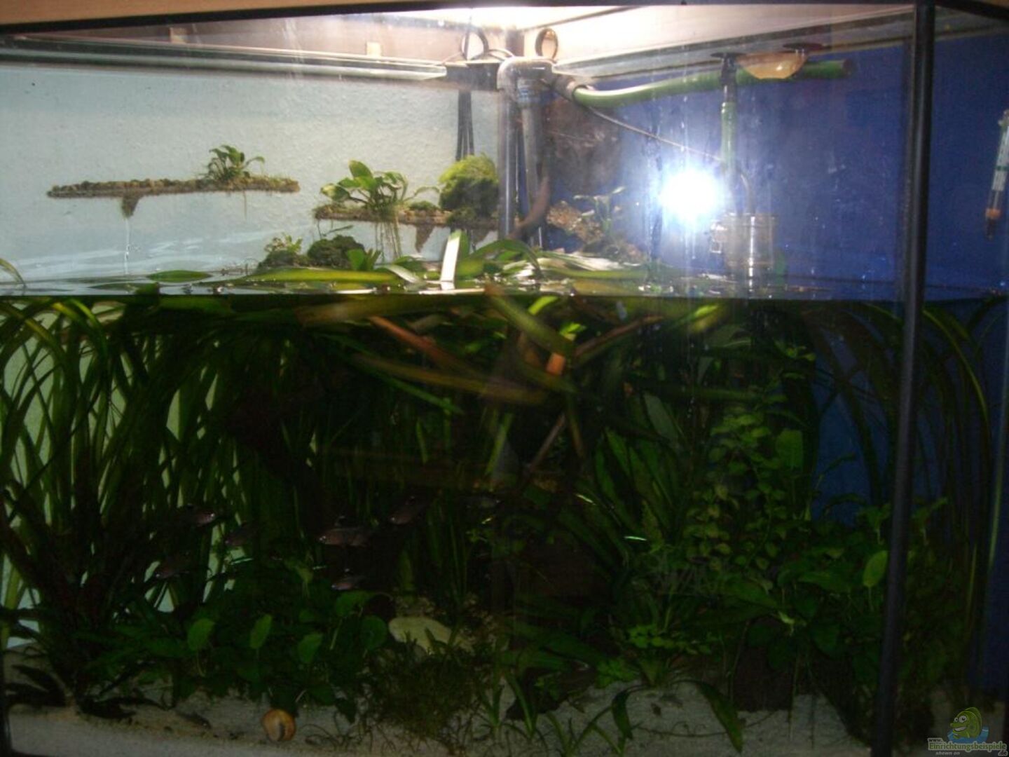 Um die gro??e Höhe etwas zu überbrücken, habe ich streifen aus Plexiglas geschnitten (vorderseite geschwungen). Diese dann mit Kies beklebt und diese als Terrassen an den beiden Rückwänden mit Lebensmittelsilikon installiert. Anschlie??end auf jede einzelne Terrasse Javamoos gebunden (mit Angelschnur).