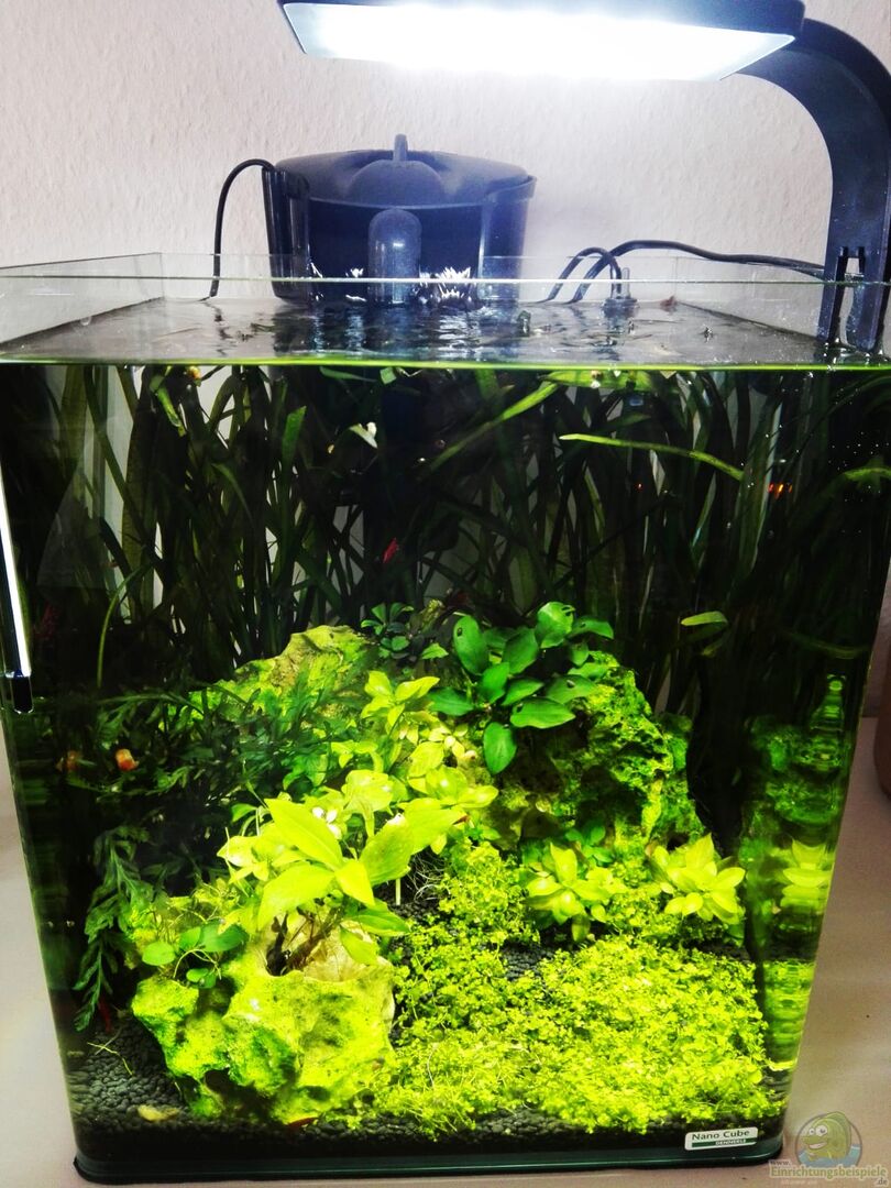 Es handelt sich um ein Dennerle 30L Nano Cube mit gewölbten Ecken an der Frontscheibe. Dieses befindet sich im Schlafzimmer auf einer Ikea Kommode.