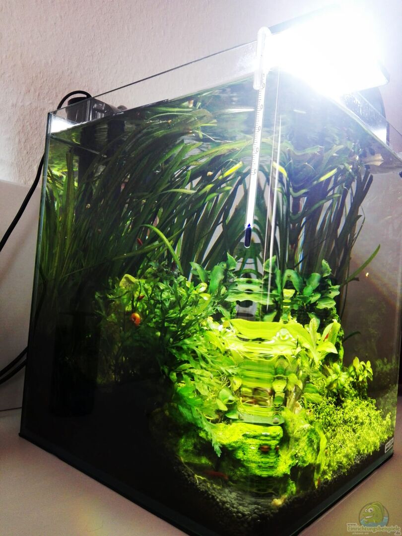 Es handelt sich um ein Dennerle 30L Nano Cube mit gewölbten Ecken an der Frontscheibe. Dieses befindet sich im Schlafzimmer auf einer Ikea Kommode.
