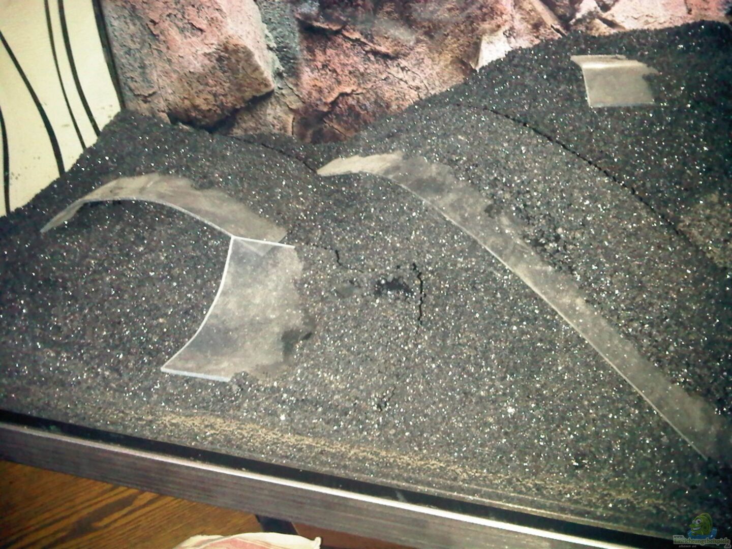 3 Ebenen über 2 Terassen dargestellt. Die Terassen wurden mit Plexiglas ´zum halten gebracht´. Auf dem Plexiglas ist mit Aquariumsilikon der Bodengrund aufgeklebt. In den Terassen eingearbeitet wurden drei Höhlen aus halben Kokusnussschalen, ebenfalls mit Bodengrund beklebt.
