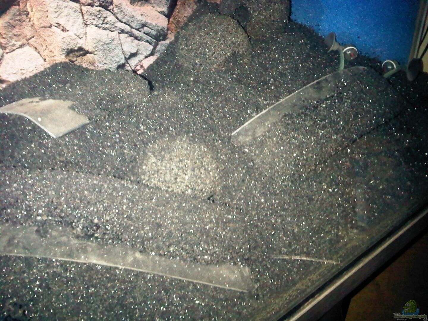 3 Ebenen über 2 Terassen dargestellt. Die Terassen wurden mit Plexiglas ´zum halten gebracht´. Auf dem Plexiglas ist mit Aquariumsilikon der Bodengrund aufgeklebt. In den Terassen eingearbeitet wurden drei Höhlen aus halben Kokusnussschalen, ebenfalls mit Bodengrund beklebt.