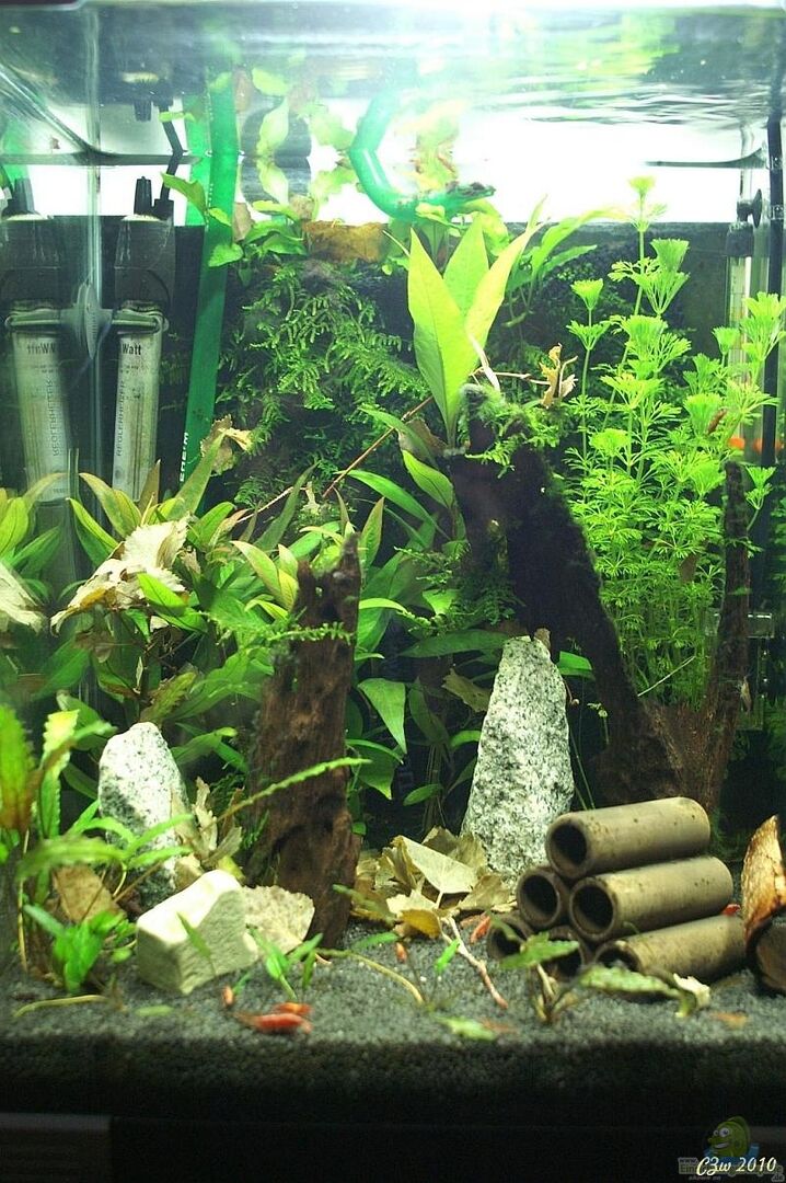 ´Kantenloses´ Becken mit nach vorn abgerundeten Ecken Das AQ steht auf unserem alten Telefontisch ;-) Rückwand aus einem ´Stoffsack´ welcher mit Saugnäpfen am Becken innen befestigt ist. Der Stoffsack ist ein Neylon Sack, der zuvor 14 Tage gewässert wurde. Zur Verbesserung der Stabilität ist im Innern des Stoffsacks das Drahtgeflecht auf welchem das Javamoos geliefert wurde eingesetzt. Schwarzer Hintergrund sind Reste meiner Unterlegematte von einem alten Becken
