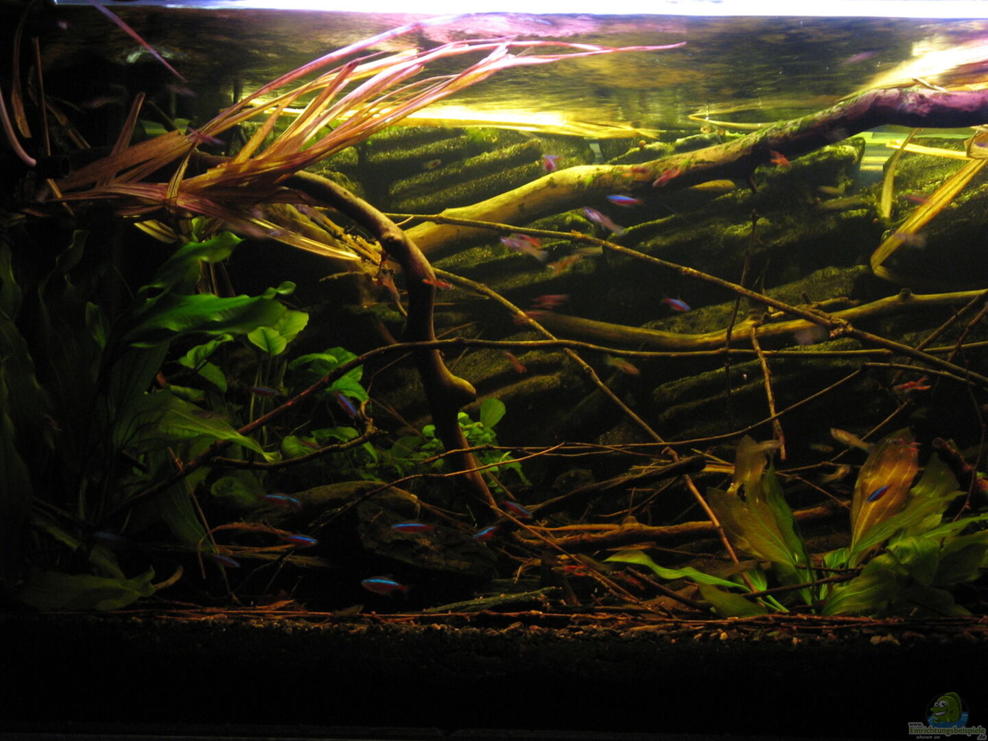 Standard Becken aus Float Glas, sto??verklebt mit Mittel- und Seitenstegen. Aquarien Aluminium Abdeckung "Stratos" von Gie??emann inkl. T5 Leuchtbalken. Momentan werden aber 2 T8 Leuchtbalken benutzt. Unterbau aus Ytong Steinen, verkleidet mit Sperrholz Pappel und wei??er Rauhfasertapete tapeziert. Daneben die Techniksäule aus Spanplatten, ebenfalls tapeziert. Verdeckt Filter, Kabel, UVC Klärer etc. und wird bei Bedarf einfach beiseite geschoben. Die Idee hinter der Gerstaltung: . [...]