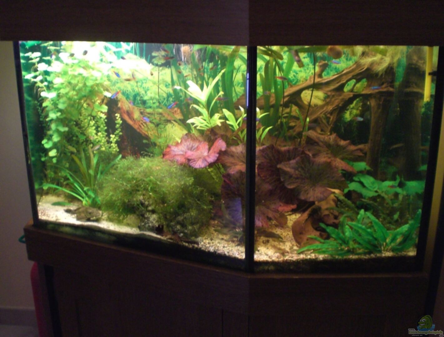 Das Becken wurde als Sonderanfertigung ersteigert, deswegen auch die spezielle, der örtlichen Umgebung angepasste Form. Die Glasstärke beträgt 10mm, und die Bodenplatte 15mm.