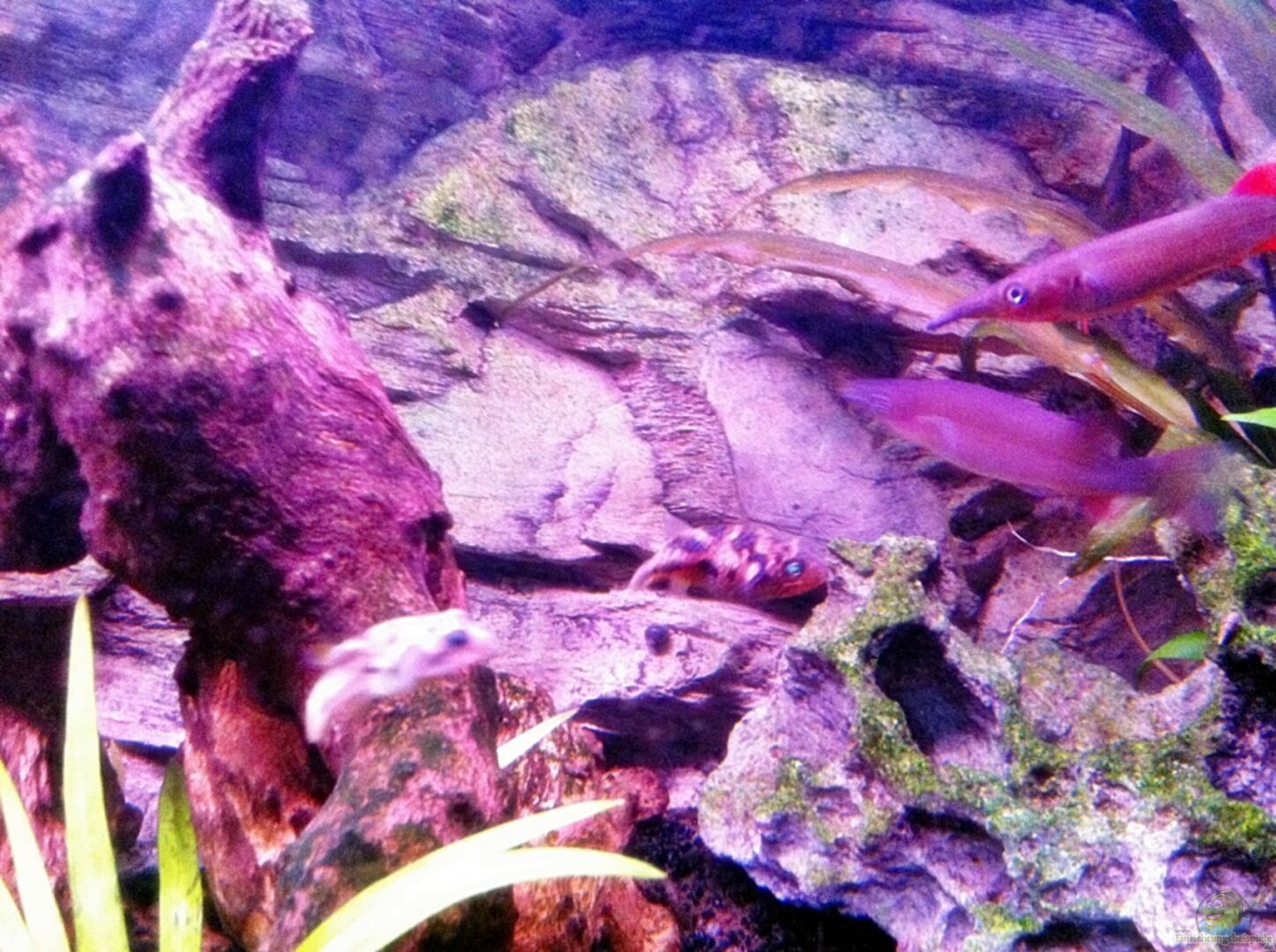 drei (1m/2w) Carinotetraodon travancoricus drei (1m/2w) Dermogenys ebrardtii zwei Garra ceylonensis zwei Apfelschnecken ca. zehn Turmdeckelschnecken zehn Posthornschnecken