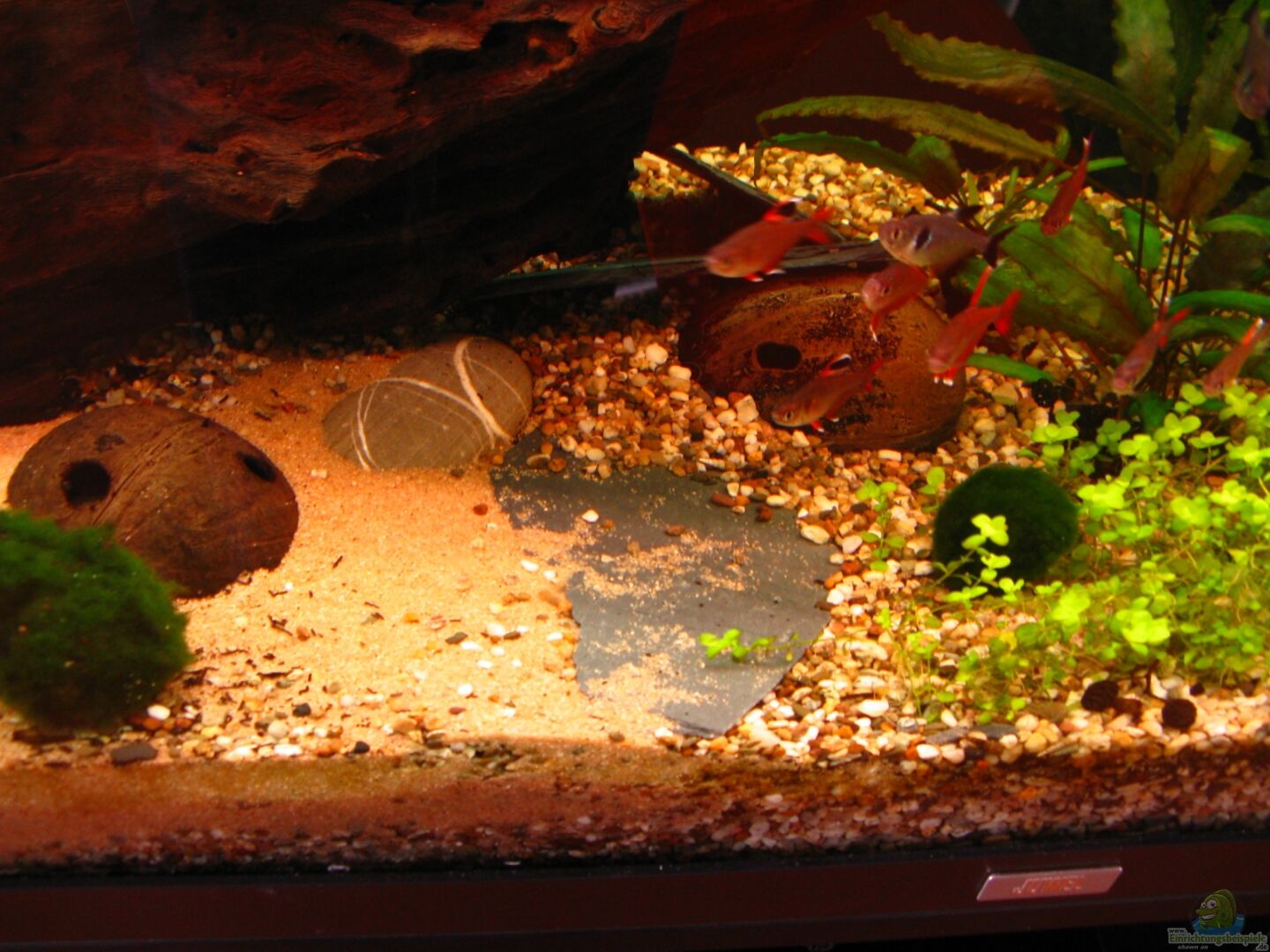eine Mangrovenwurzel, hohl und wuchtig (ca. 60 x 25 x 20 cm) zwei kleinere Wurzeln (wahrscheinlich auch Mangrove) drei Kokosnusshälften mit kleinen Löchern für die Kakadus zwei Blumentöpfe ein Flussstein drei Schieferplatten schwarze Rückwandfolie ca. 20 Erlenzäpfchen