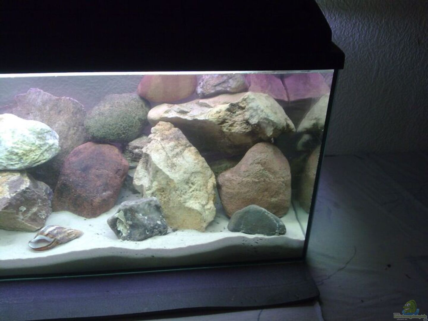 Steinaufbauten in 2 Reviere geteilt (in der Mitte ist keine Moeglichkeit ueber die ganze Laenge durchzuschwimmen, also quasi eine Trennwand im Steinhaufen), um dem Altolamprologus Weibchen bessere Rueckzugsmoeglichkeiten zu bieten.