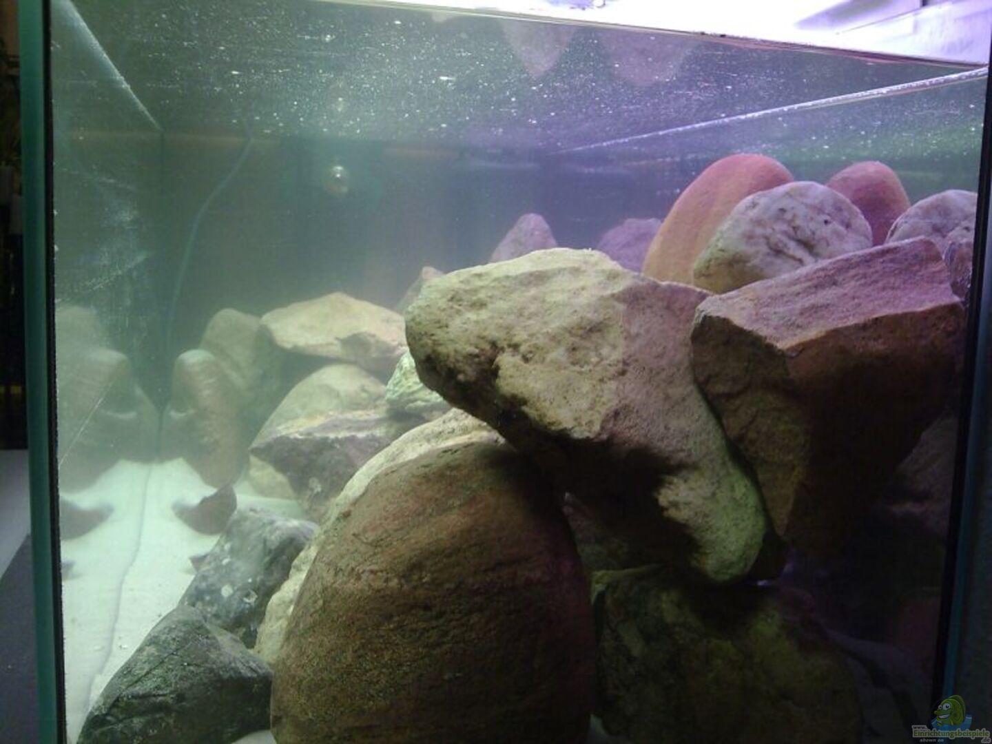 Steinaufbauten in 2 Reviere geteilt (in der Mitte ist keine Moeglichkeit ueber die ganze Laenge durchzuschwimmen, also quasi eine Trennwand im Steinhaufen), um dem Altolamprologus Weibchen bessere Rueckzugsmoeglichkeiten zu bieten.