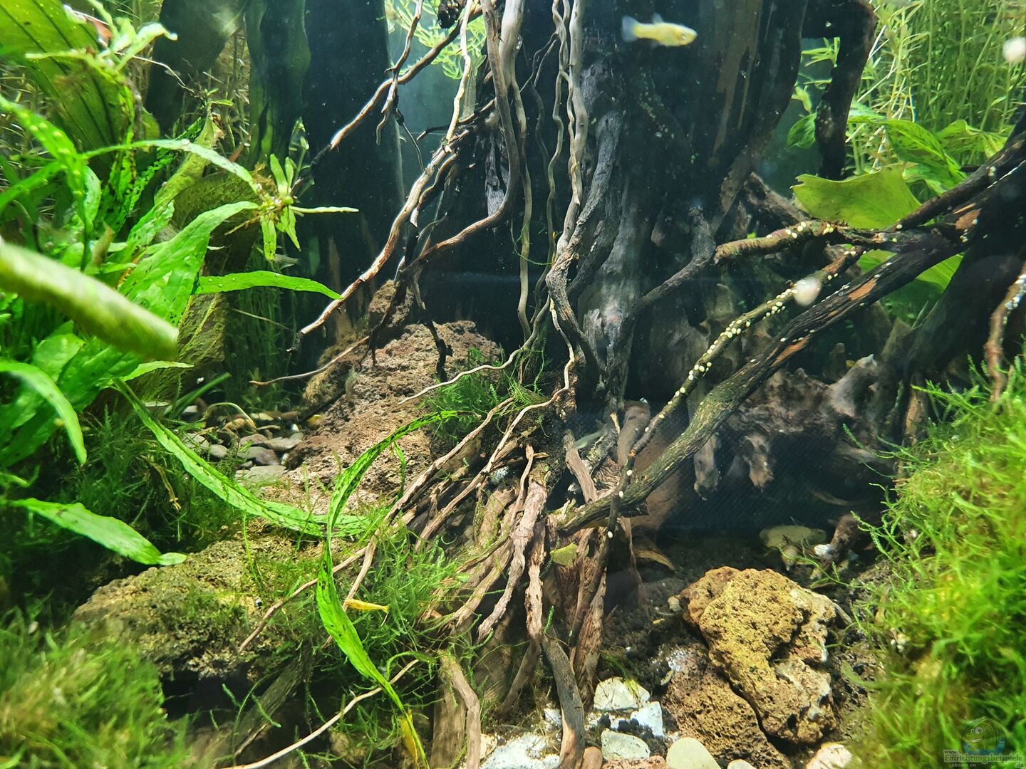 rote Lavasteine, von Handball gro?? bis kleine Bruchstücke. Eine "Hauptwurzel" in der Mitte. Diese habe ich aus Resten der Auflösung meiner alten Aquarien zusammengeschraubt bzw. geklebt (Superkleber und Zigarettenfilter Technik). Diverse trockene ??ste Eine Wurzel gefunden beim Spaziergang