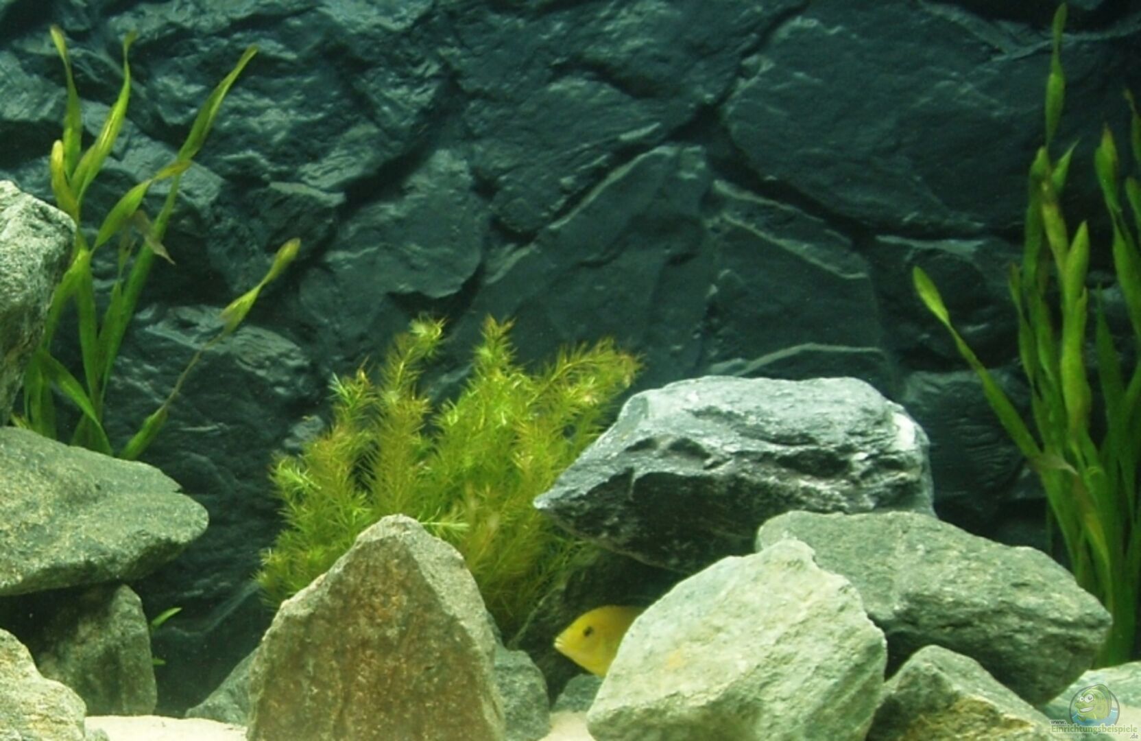 Nur mäsige Bepflanzung: 1x Brasilianisches Mooskraut (Mayaca fluviatilis) und 2x Asiatische Wasserschraube (Vallisneria asiatica). Dazu, aufgebunden auf die Steine, 1x Javamoos (Vesicularia dubyana) und 1x Teichlebermoos (Riccia fluitans).