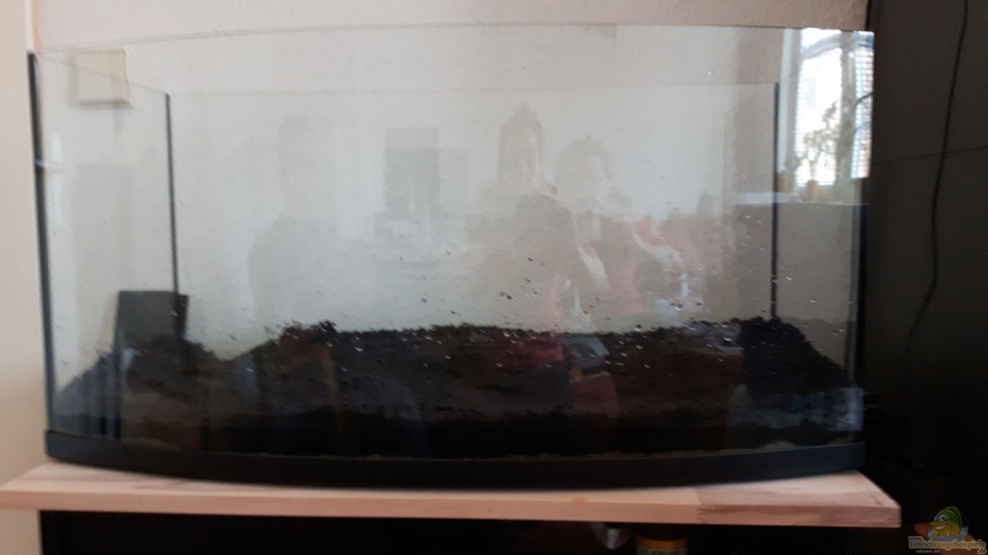 Das Becken hat eine gewölbte Frontscheibe, daher an den Seiten 30 cm, in der Mitte 38 cm tief. Der grö??te Teil des Wassers wurde aus dem alten 96 l Becken übernommen, genauso der bereits seit längerem laufende Au??enfilter sowie die Pflanzen.