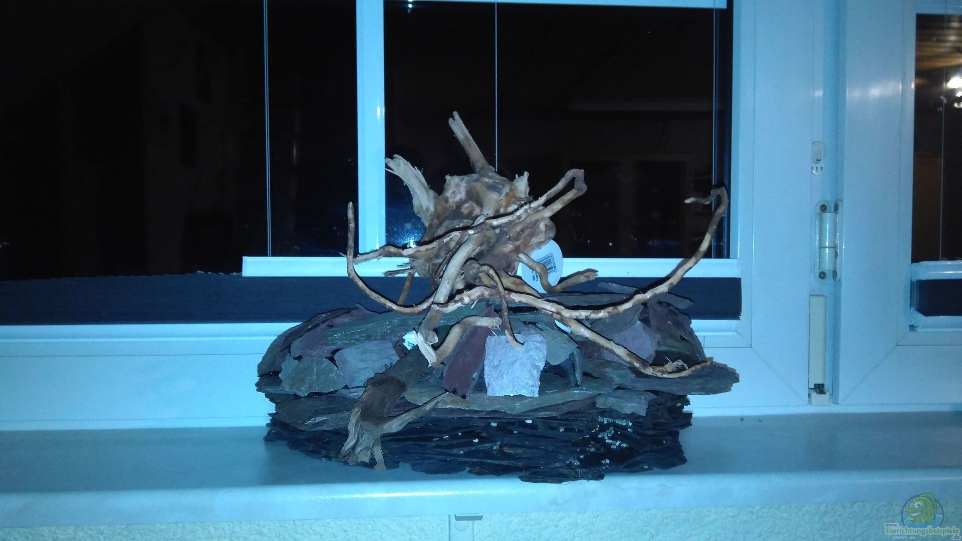 Schieferterrasse aus gesammelten Naturschiefer mit 5 versteckten Höhlen (verklebt mit Aquariumsilikon), eine vergrabene Kokoshöhle im Grund , 3 Seemandelbaumrindenhöhlen, Kunstterrasse, Juwel grey Stone Rückwand, 2 Moorwurzeln und etwas einzelnes Holz, 10 kg Ardenner Brocken Kalksteine und 2 wei??e Lochgesteine.