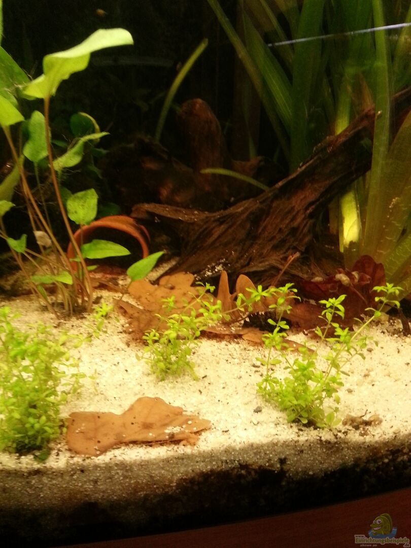 2x Stein 5x kleine Wurzel (eine davon hängt am oberen linken Beckenrand; auf ihr wurde Lomariopsis lineata angebracht) 1x mittlere Wurzel 1x Tonröhre 1x Steinhöhle (künstlich) 1x Kokosnusshohle Erlenzapfen, Eichenlaub