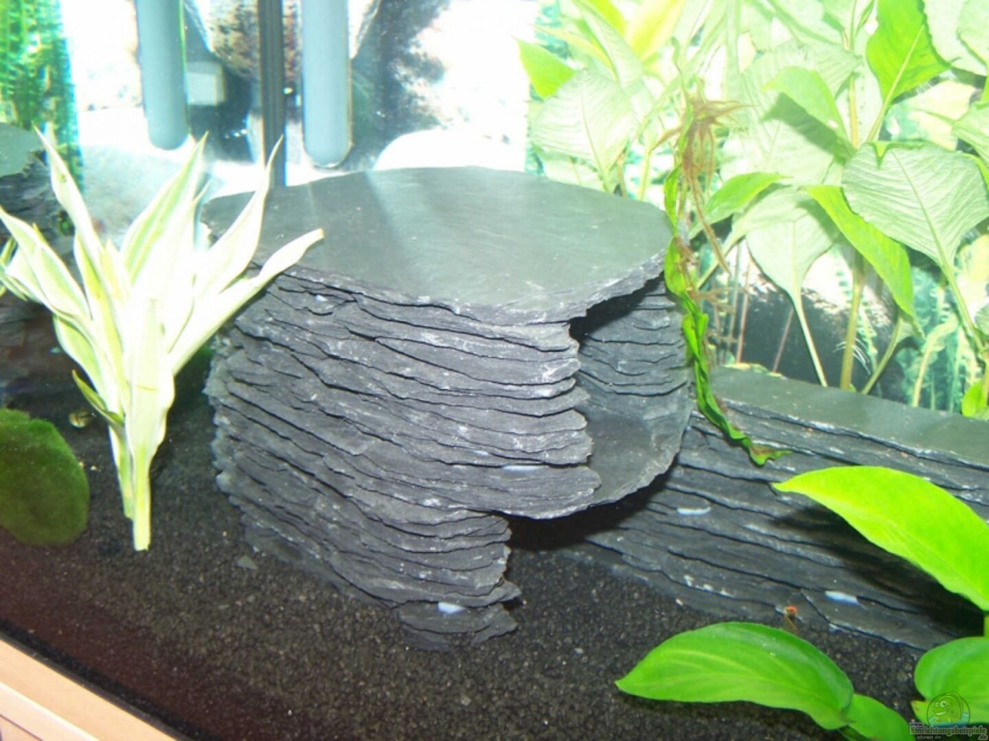 Selbsgebaute Deko mit 2 Höhlen (1 offen zum durchschwimmen) aus Schieferplatten mit Aquarien-Silikon verklebt
